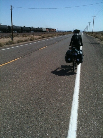 We pedaled more easily over flat ground for miles with the busy train tracks on our right side and a broad plain bordered in the distance by mountains on the left. Dirt devils spun lazily up into the pale blue sky and occasionally it black crows would amass around the train tracks in search of carrion. Around four o’clock the inclination changed again and we picked up speed. By five we had reached the junction between Goff’s road and the I-95. We were making good time so we decided to continue the 30 miles to Needles.