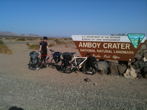We learned our lesson not to ride in the middle of the day so after a break in Amboy we rode a out another 15 miles as the sun set. It was a nice evening ride with a clear sky and moon bright enough to see by (we did still wear our lights though!). We set up camp and slept relatively soundly from 9 until about 1, when we were roused by the thunderous flapping of our tent. The wind storm continued for hours, broke a tent pole in two places and kept us awake with the noise and constant pounding wind. We’d had enough of trying to sleep and decided to pack up just after 5. It was cold and windy but at least the wind was at our back as we climbed the grade out of the canyon. It was a beautiful ride that morning with the sun creeping up behind us like a spotlight following our travels across a dark stage.