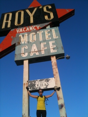 We rode about 5 miles and found shelter under a bridge to wait out the heat of the day. There we read, snacked on Cliff Bars and peanut butter, a new staple in our diets, and napped before pressing on to another Route 66 landmark, Roy’s Cafe in Amboy.