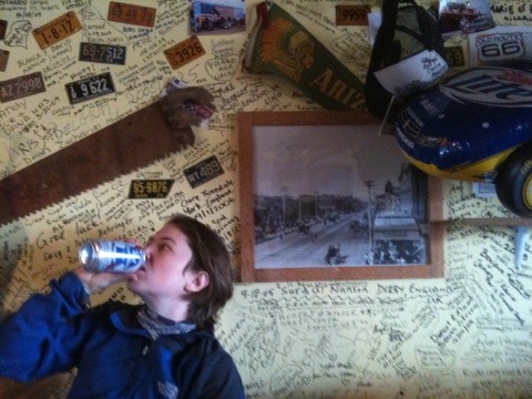 An eclectic group of people, the Occupy walkers told us of their incredible experiences on the road and their more recent days with the Hualapai people. The Occupiers were invited to an Easter picnic on the reservation, and the Hualapai would be there the next day at noon to pick them up in the back of a pick up truck. The Hualapai invited us as well, but because we don’t eat meat or celebrate Easter, we continued east on the 66.