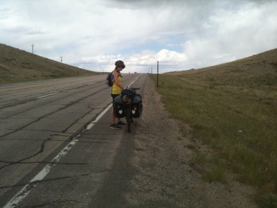 We don’t know much about Wyoming but we quickly learned one disappointing fact: the wind blows something fierce around these parts. The day we crossed the border was rough. We left Walden, CO once the rain had cleared but the local thermometer read a chilling 39 degrees at 10am. Shortly after leaving town Mi’s back tire lost a battle with a bent, rusty nail. The nail had plunged almost all the way into the tire so the damage was more extensive than the slime could fix. It was cold out and changing the tube on the back tire is more fussy than the front so the process was all the more unpleasant. At noon we finally began our day.