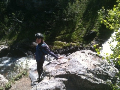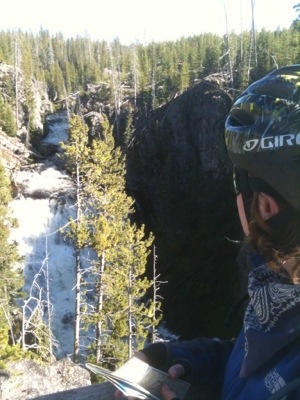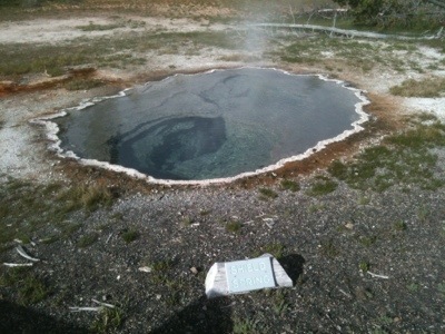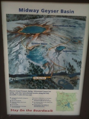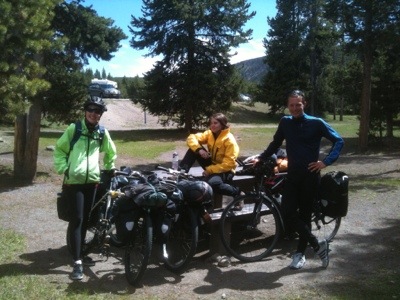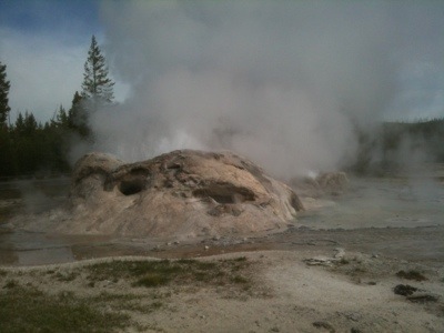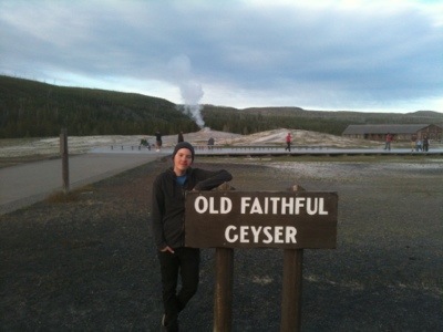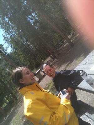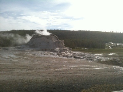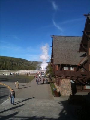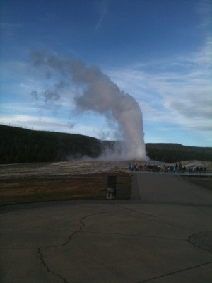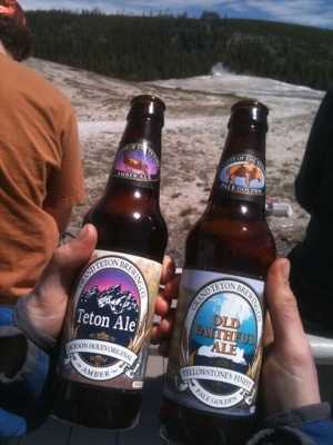 We wrapped up our walk at ten so we would have enough time to pack up before checkout. We got our bags outside just in time to see Old Faithful erupt again. We took a few minutes to watch before packing our bags onto our bikes. By this time it was almost lunch time and we were hungry. We went to the general store and picked up a couple micro brews, one named Old Faithful and the other named the Grand Tetons. We then headed to the closest benches by Old Faithful make sandwiches and wait for once more for the eruption. We watched with hundreds of other people as the geyser made its famous performance. We waited for the crowd to disperse before navigating our way back to the road. Before setting off we checked out the visitor center. On our way we had our picture taken by numerous tourists which always feels kind of strange. It is bizarre being an attraction that people want to photograph. We will be in a bunch of family photo albums!