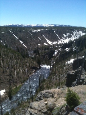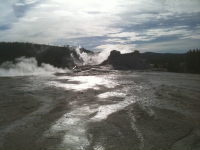 We rode the 15 miles to Old Faithful and passed two more Continental Divides, one being 8391ft and the other 8262 ft. As leisurely as we wanted to ride, we still spent a majority of the time climbing, stopping frequently for breathtaking views of lakes, rivers, and snowy mountain sides. As we approached our destination, we began to see countless plumes of steam rising from the phenomenal geysers ahead.