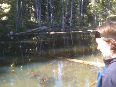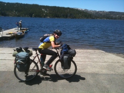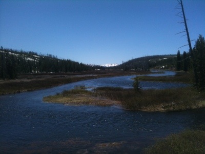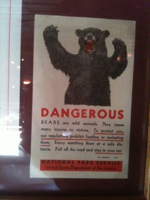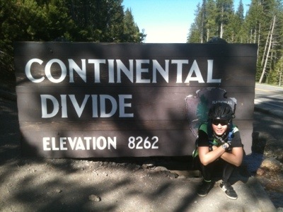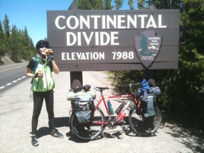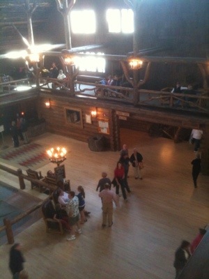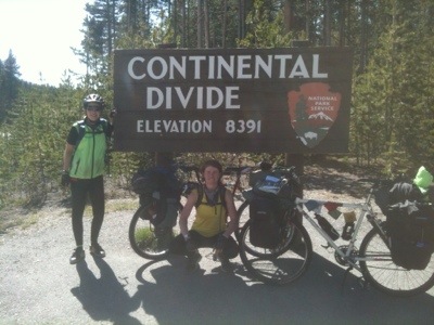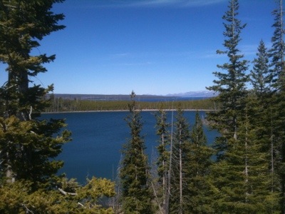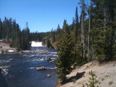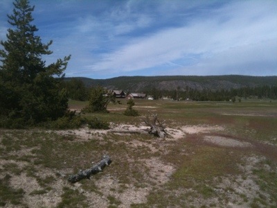 We rode uphill until the road plateaued to a pleasant flat stretch lined closely by trees. Despite not knowing where we would spend the night we took our time and stopped often at turnouts to take photos. We stopped at a waterfall, Lewis Lake, another Continental Divide, and gawked with the other vacationers at the occasional animals gathered near the roadside. By lunchtime we had cycled to Grant Village, where we asked about the possibility of lodging. We were told that there were no vacancies anywhere, that the rooms were over $150, and that the only campground open was in Madison. Then the manager made some calls and found us a vacancy at the Old Faithful Inn. Although we would rather have camped to save money, we were thankful to have found a place for the night. Plus, the manager helped us get 25% off the room.