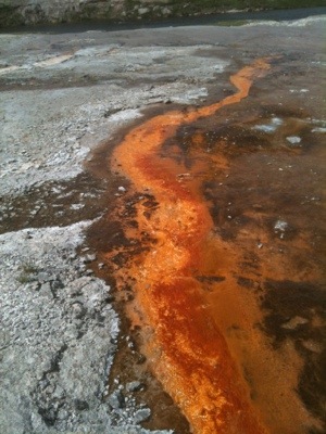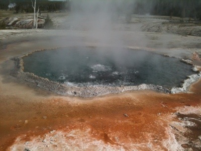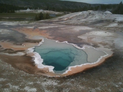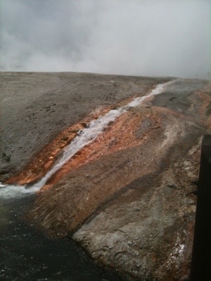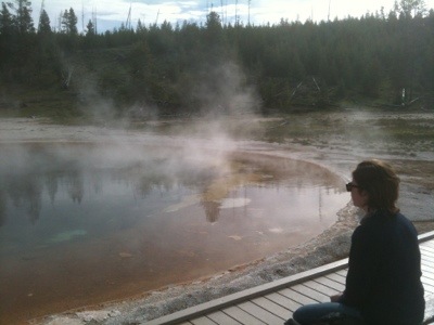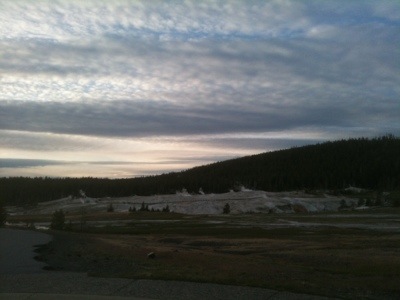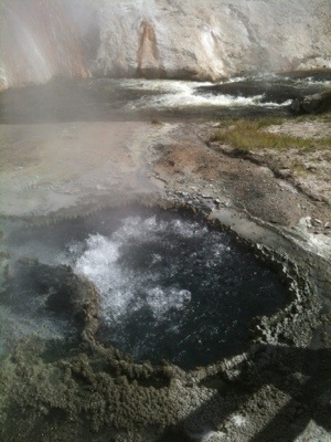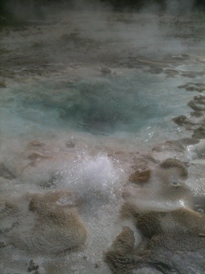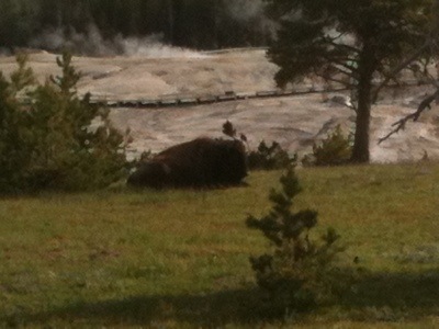 The next morning’s walk was incredible. It began with coming face to horned face with a group of bison that were sleeping on the warm grass on either side of the most direct route to the geysers. There were about eight shaggy adult bison and five auburn babies. We took the long way around to view the multitude of geysers and thermal pools. The walkway was a platform raise above the thermal beds that were white and crusty with minerals, mainly silica. There were a few people walking around but we mostly had it to ourselves, which was a little unnerving once we started to see bear tracks in the sand on either side of the wooden walkway. There were also abundant bison tracks circling the bubbling pools; the wooly beasts had obviously been seeking warmth from these natural hot tubs.