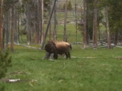 We were able to get the weather forecast from the Inn and knew rain and snow were due as soon as that afternoon so we made our way towards West Yellowstone, MT. We rode on and stopped frequently to view several herds of bison. At one point there was a bison trotting nonchalantly toward us in the opposing bike lane holding up traffic. We made sure to keep a car between us and the bison just to be sure we wouldn’t freak it out.