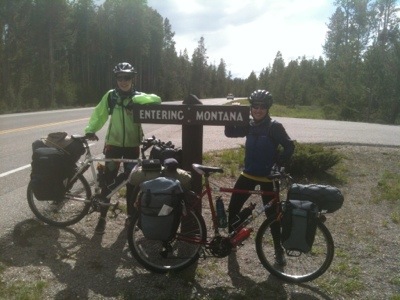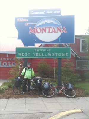 We set off for the last 15 miles of our Yellowstone experience when the wind started to pick up. We knew this wind would push in the storm so we quickly rode out of the park and into our sixth state of the journey, Montana. As we were taking photos at the dinky sign that marked our entrance into Montana a woman trotted out from a turnout and offered to take out picture. She was a member of a team car touring around the country to spread the word about the Silver Oak Winery from Napa, CA. They asked us to pose with their Tower Tour sign so be sure to check us out on their website at http://www.silveroak.com/TowerToir2012!
