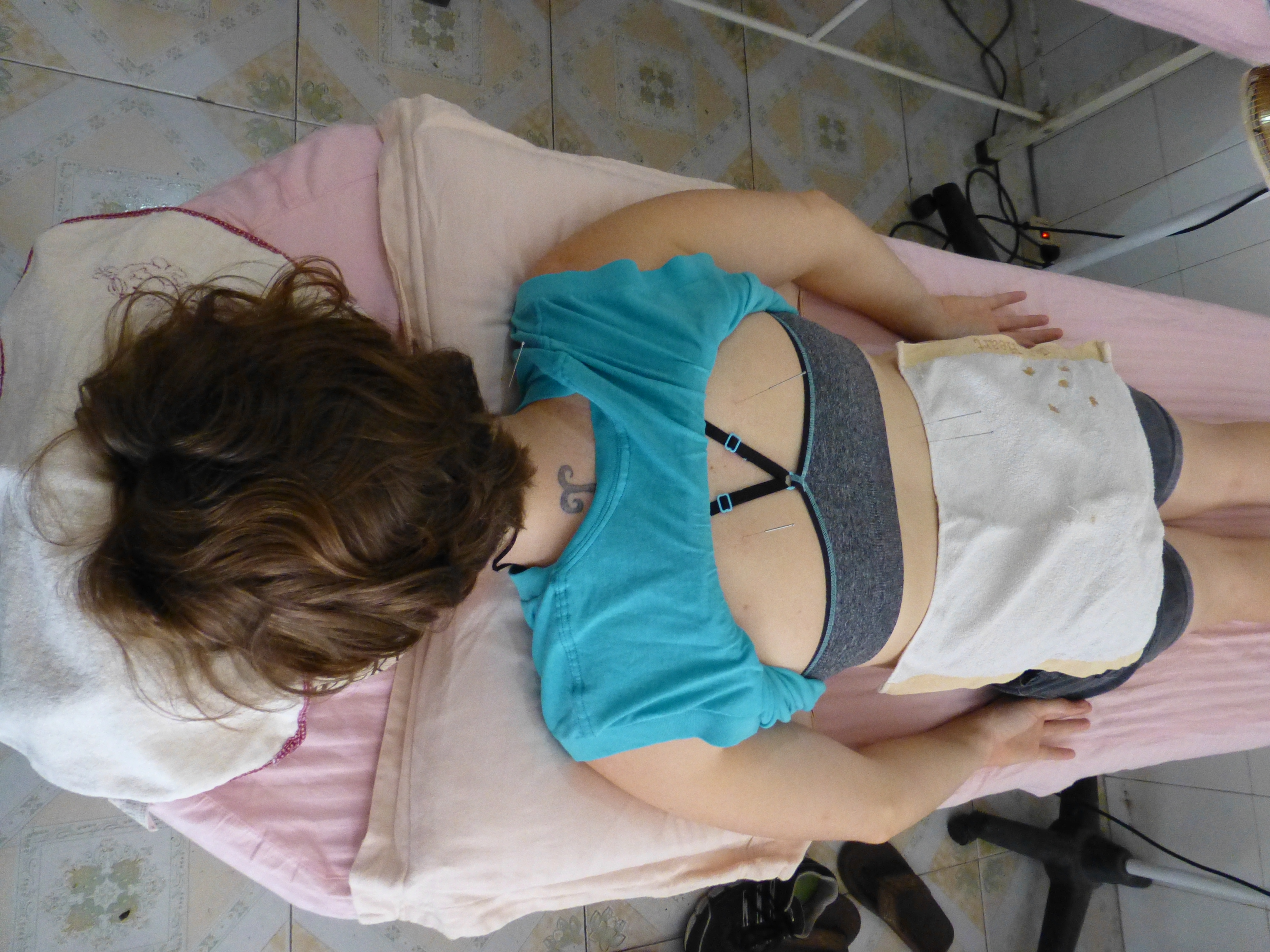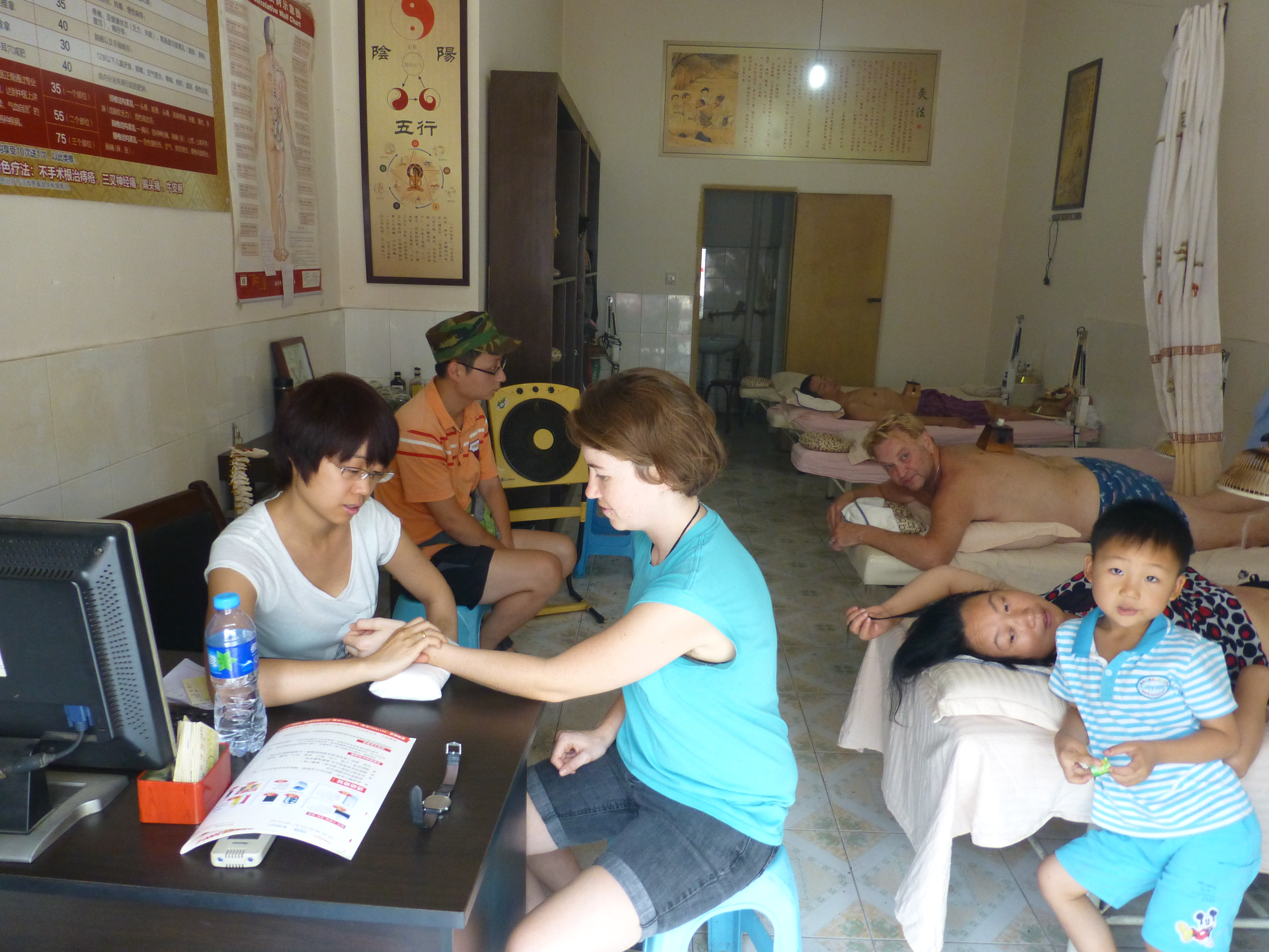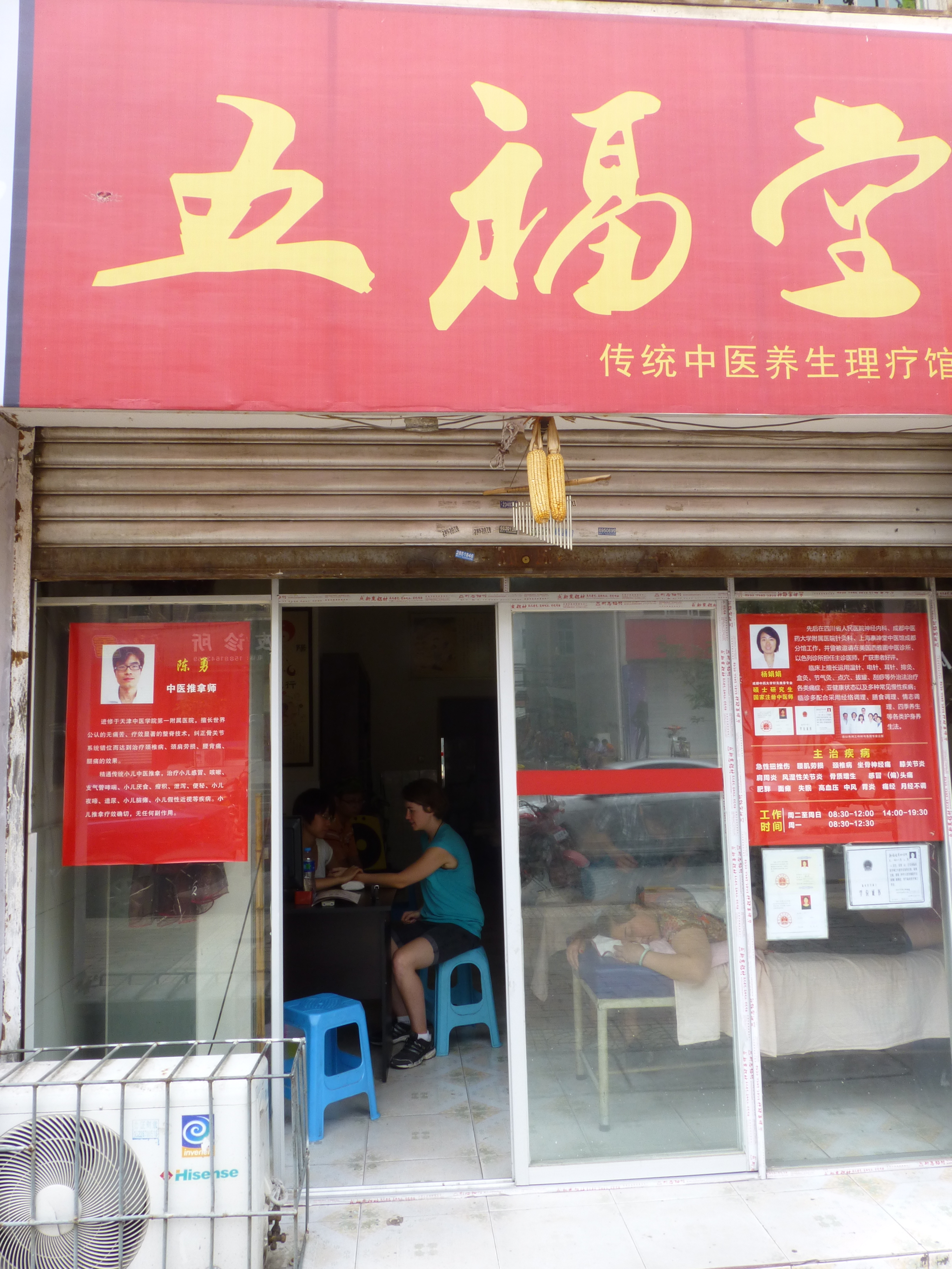 The fifteen-minute ride down to the village exposed us to all new sights and smells. There were street markets, fireworks, a temple, and a more traditional, small town feeling. We pulled up to the doctor’s, where Mark has been getting treated regularly, and were introduced to a whole new world of healing. Mark had warned us that in China there is no such thing as confidentiality, which was evident in the setup of the place. There are six cots in a small room with a big plate glass window facing the street. When we arrived each bed was occupied by someone being treated with acupuncture or cupping. To begin the treatments, the doctor will diagnose you by feeling your pulse with three fingers- testing each wrist for weaknesses in your pulse which indicate problems in different parts of the body depending which finger detects the problem.