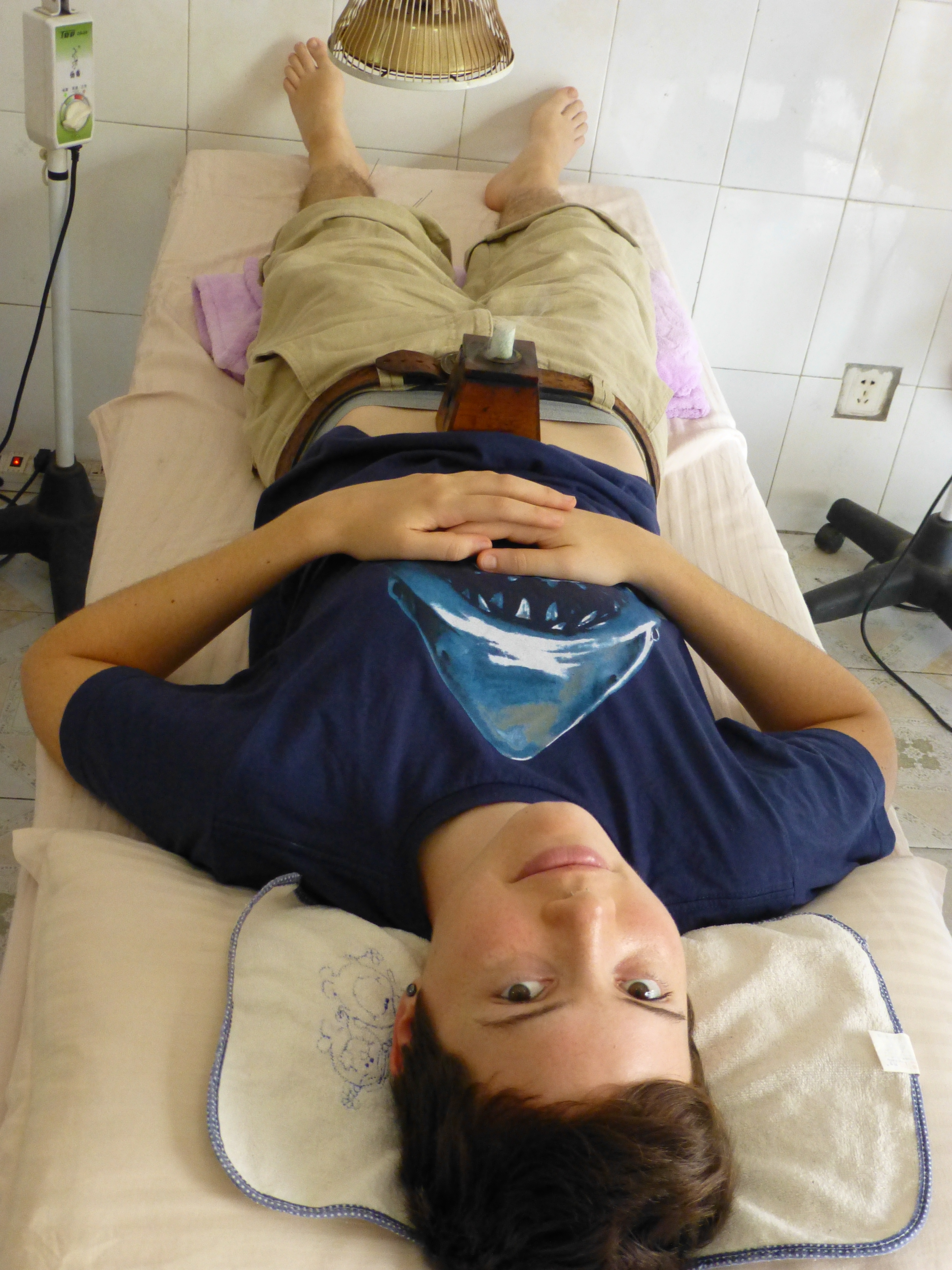 Kelly was diagnosed first and her treatment for her back problems began with a brief adjustment from the “chiropractor” and masseur, the doctor’s husband. Then, the doctor applied three needles into Kelly’s back and one in her neck, two of which had burning wormwood on the end. The coils of smoke filled the air with a heady aroma similar to sage. Roughly thirty minutes later, the needles were removed and ten glass cups were applied to her back. To create suction, the air is vacated from the cups with a burning wand. Each cup signifies a region in the body and ailments in those areas are indicated by how much flesh is sucked up into the cup and by the color of the bruising.