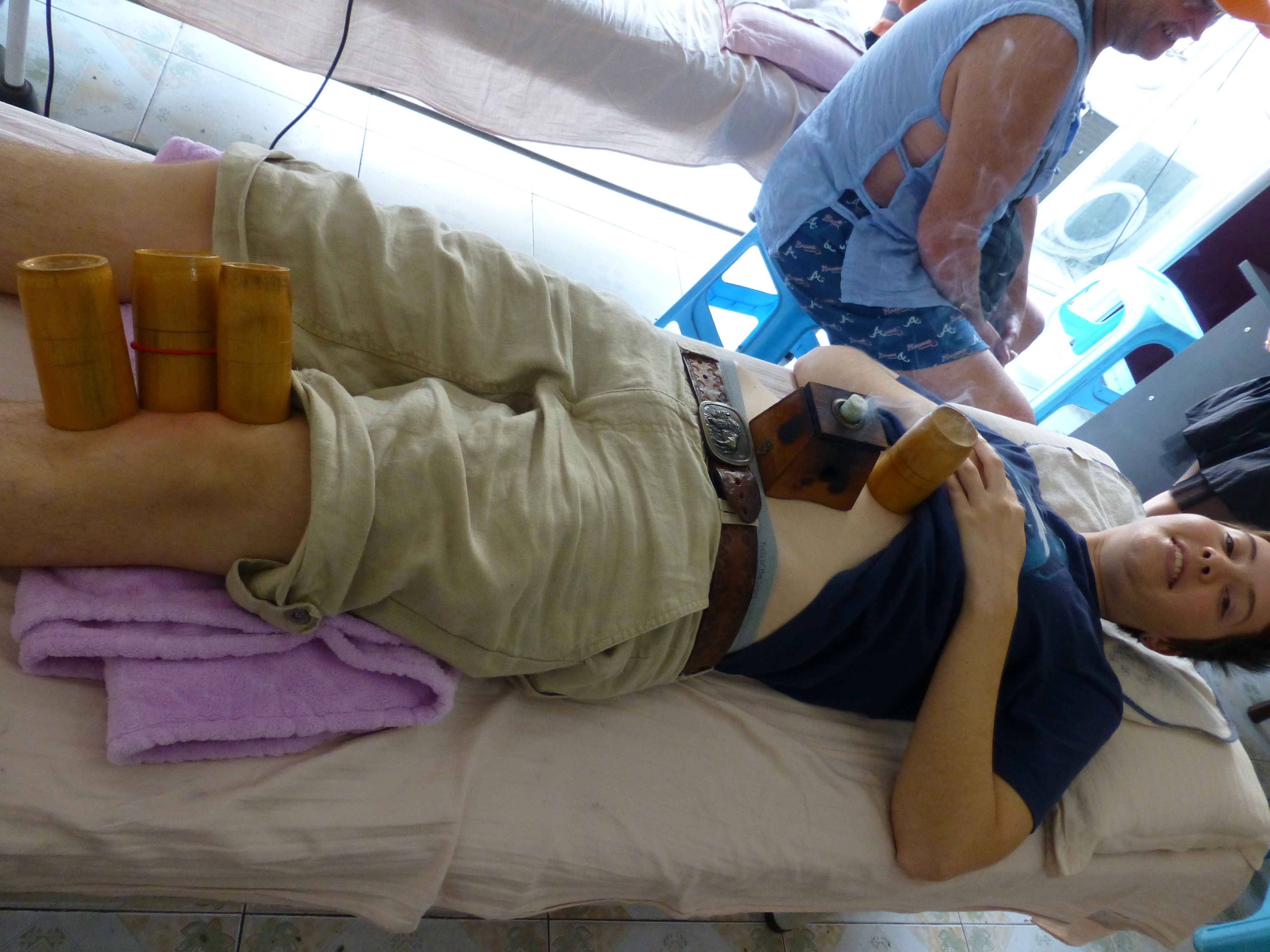 Mi’s treatment for injured knees came next. First, a small wooden box with burning wormwood placed on the abdomen was utilized to balance the yin and yang (Mi doesn’t have enough yang apparently, resulting in low energy and unbalanced meridians). Then, three acupuncture needles went into the left knee. About thirty minutes of that, then the needles were removed and three bamboo cups were applied to the same place using the same burning wand technique.