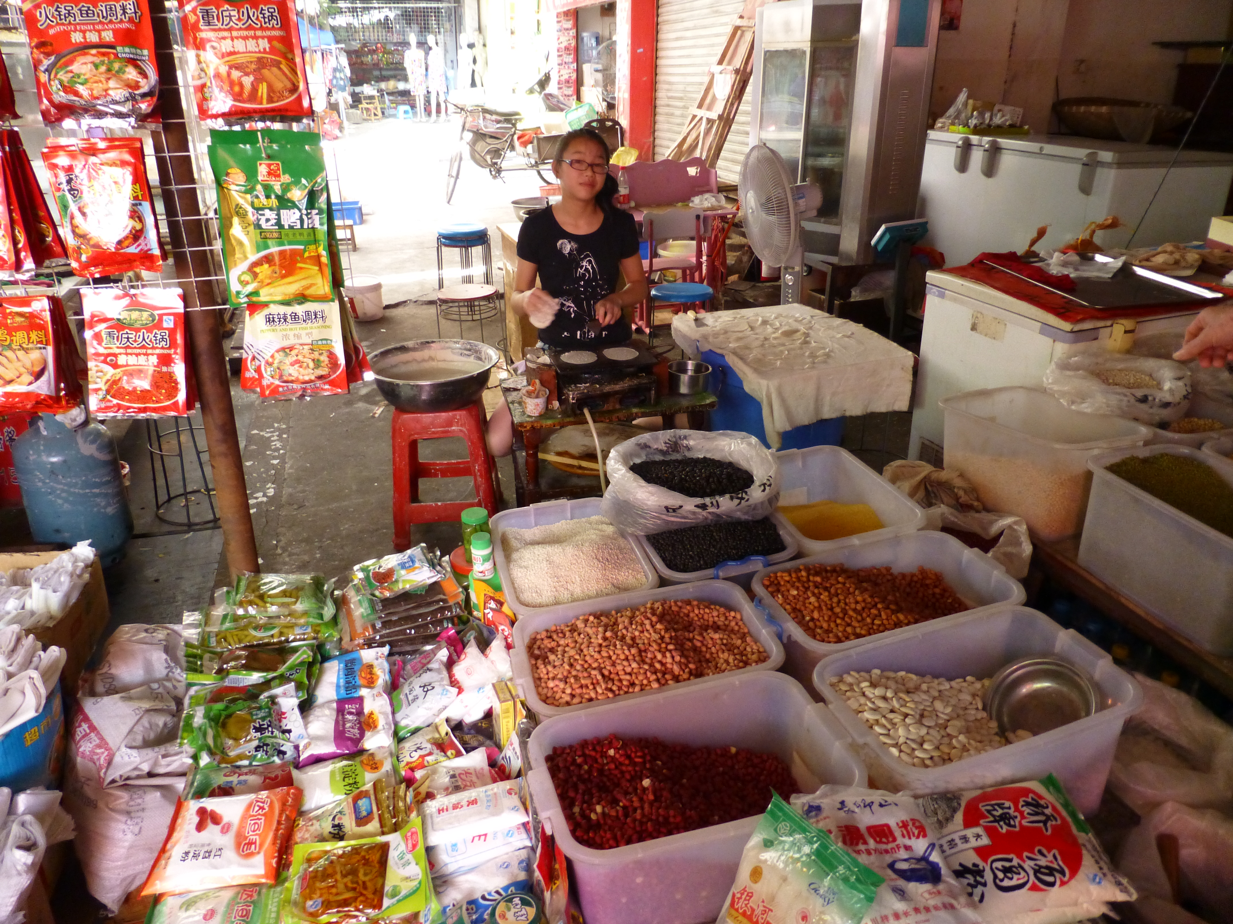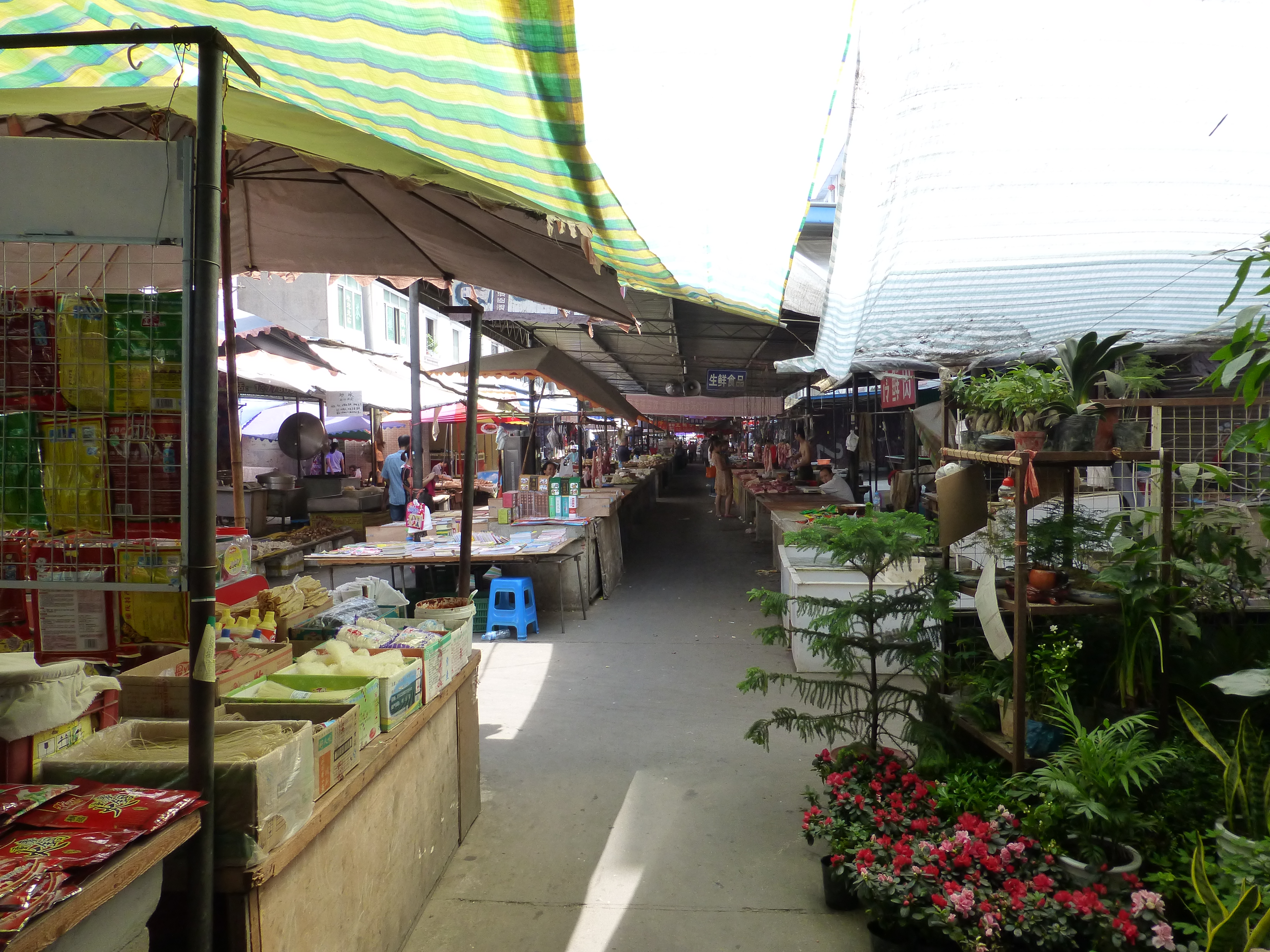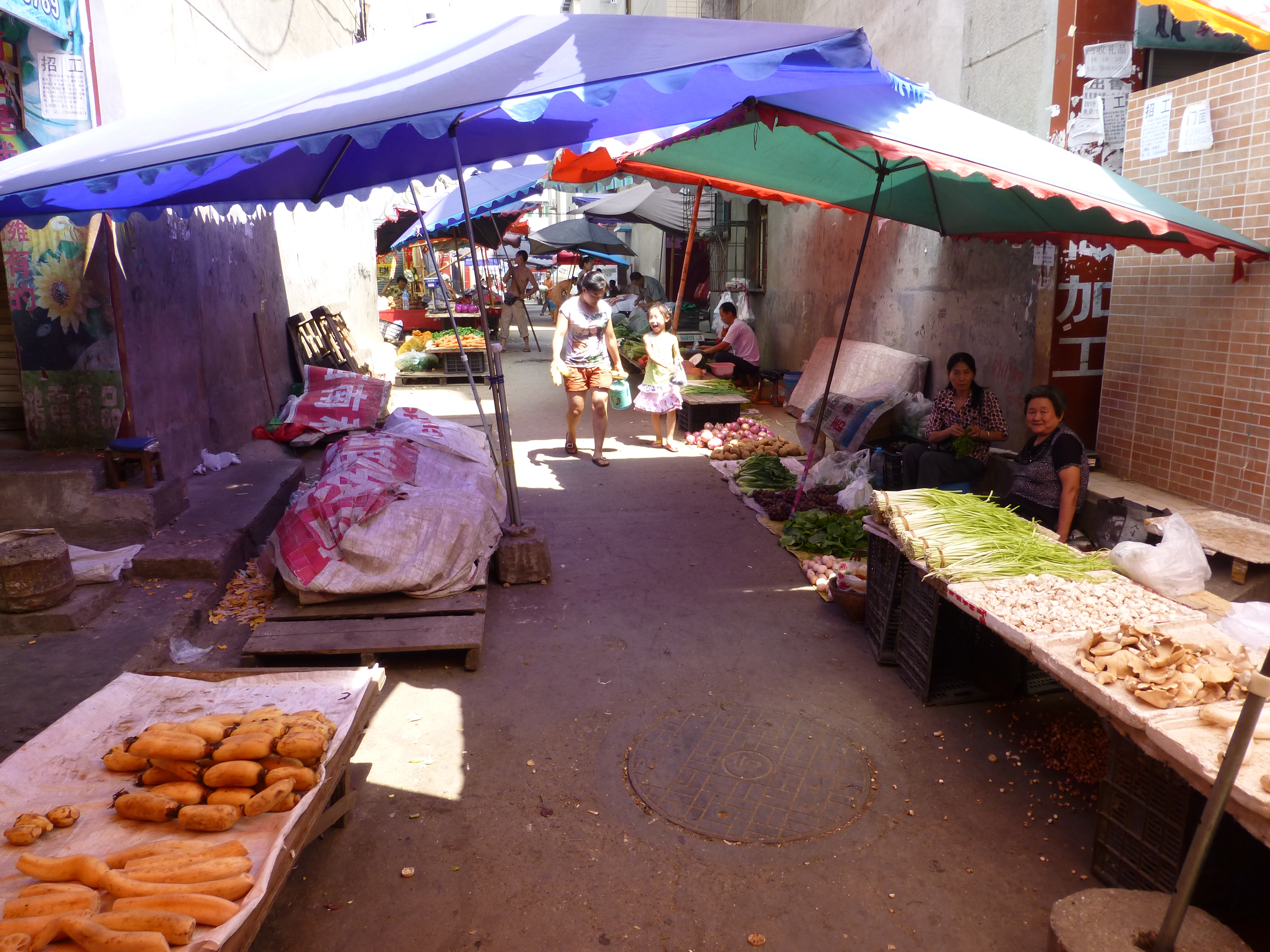 We all walked from the doctor’s office feeling restored and energized, and famished. Before jumping back on the bikes for the short ride to a nearby restaurant, we decided to visit the market across the street. It was beautiful. There were sacks of spices and beans, unfamiliar vegetables like lotus root, a whole stall devoted to the numerous kinds of tofu, meat hanging from hooks, and fish swimming in Styrofoam tanks. It was just as we had imagined local markets to be, even though this one was rather small and tame.
