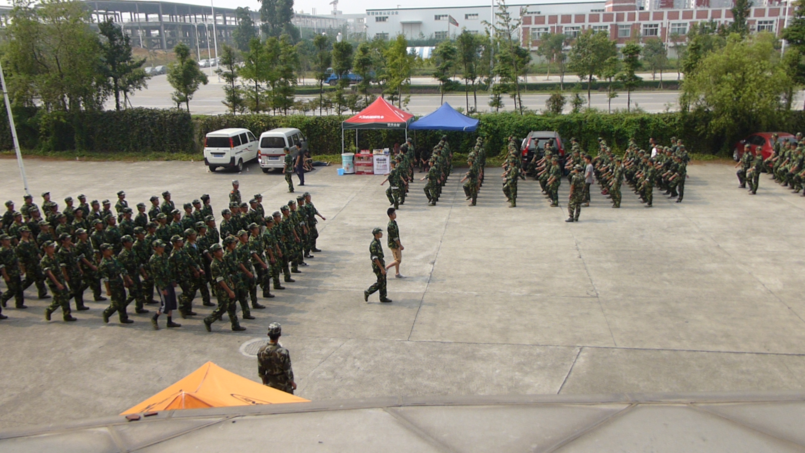 Fortunately, Tian Fu College, where we will be teaching English for the next year, is only about 20 kilometers from the airport and we made it without losing our bags. Mianyang is very different from Shanghai. In place of skyscrapers, there are small brick buildings, vegetables growing in permaculture plots by the road, and much less traffic. Before we even laid eyes on the school, we heard rousing parade music blaring from behind its red brick walls. Upon turning into the school’s front gate, we began seeing our future students, each one decked out in green fatigues and marching in unison in groups of about fifty. Michael informed us that for the first 15 days of the school year, all first year students from primary school up to college must participate in military training.
