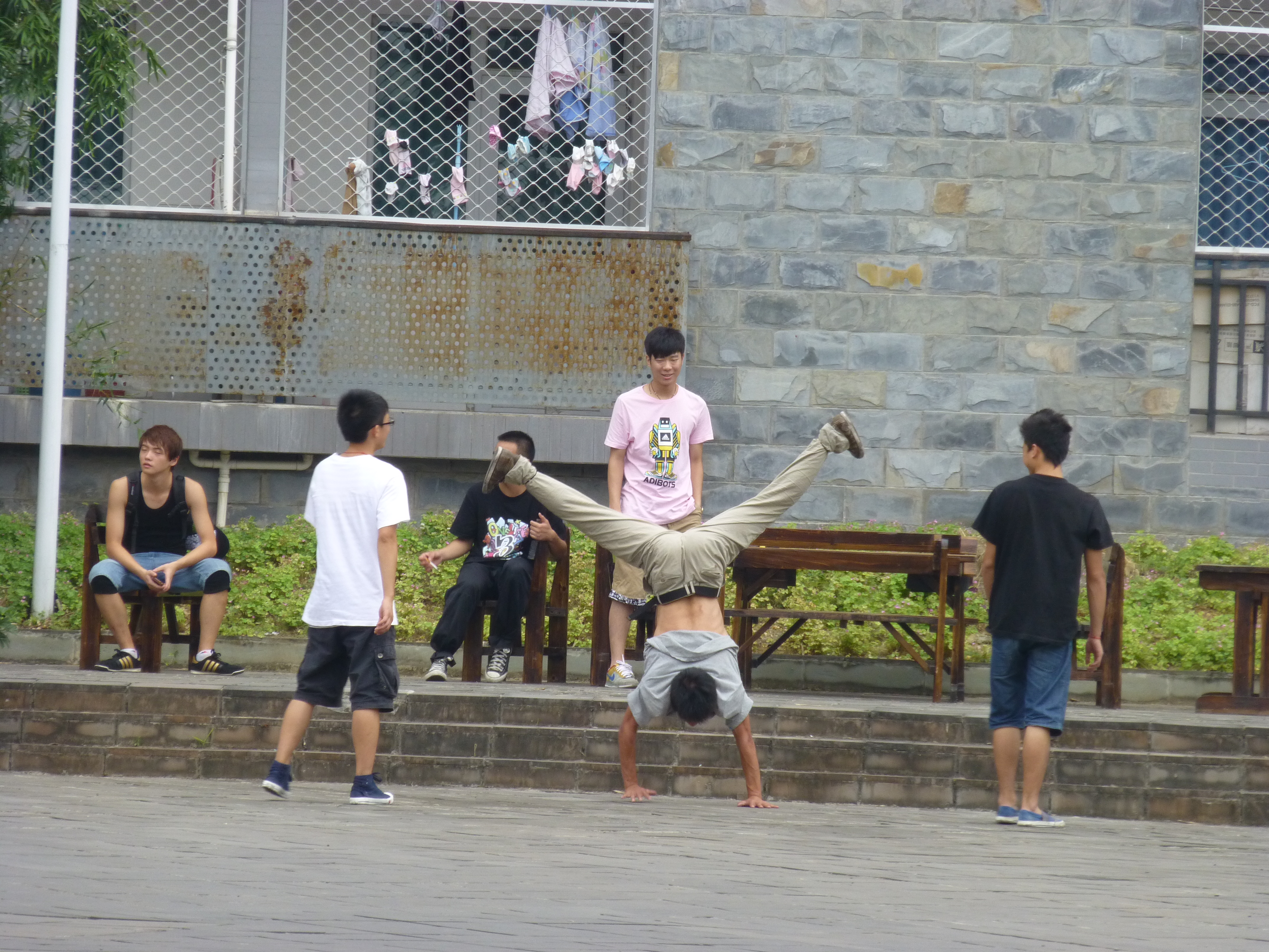 Later, we met with Michael to photocopy our passports to take to the police station. Outside his office a group of students were practicing their dance moves, which apparently exempted them from the drills their peers had to do outside. Michael is a break-dancer so he introduced us to his crew, a group of boys who were watching themselves intently in a big mirror. Mr. Wo drove us the short distance to the police station, which was closed on Sundays, so we came right back. Michael, who graduated from the college the previous year, works in the administration building which had been temporarily taken over by groups of dancers, all practicing. He introduced us to a large group of freshmen who stopped what they were doing and made an eager semi-circle around us. The cheered and smiled and asked us questions about where we are from. In response to our replies, they sang “Hotel California.” They were excited to show us the progress they were making on their dance routine so we watched them perform what moves they knew. Some of the dancers will be our students, but we won’t know which ones until next week.