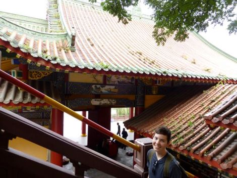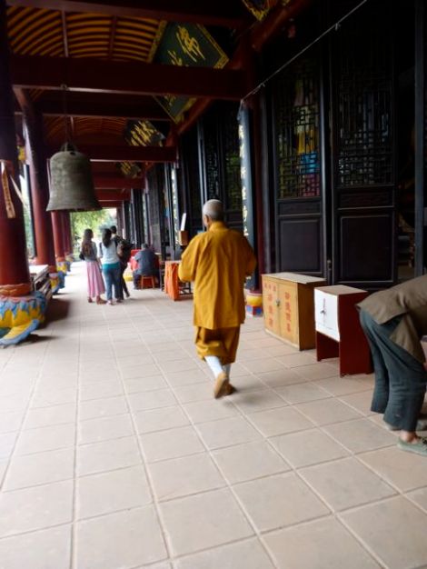 Erin and Victoria explained what each statue represents and how to address the monks. When greeting a monk, you are to hold your hands in a prayer position in front of your chest, bow slightly, and say “ē mí tuó fó,” which means may Buddha preserve us. Whenever we did this, the monks would stand and return the greeting, looking both surprised and pleased to hear a presumably ignorant Westerner respecting their customs. Each of the buildings houses at least one huge statue of Buddha, each at least 15-feet tall, beneath a ceiling painted in incredible detail.
