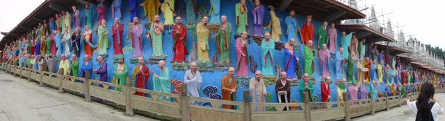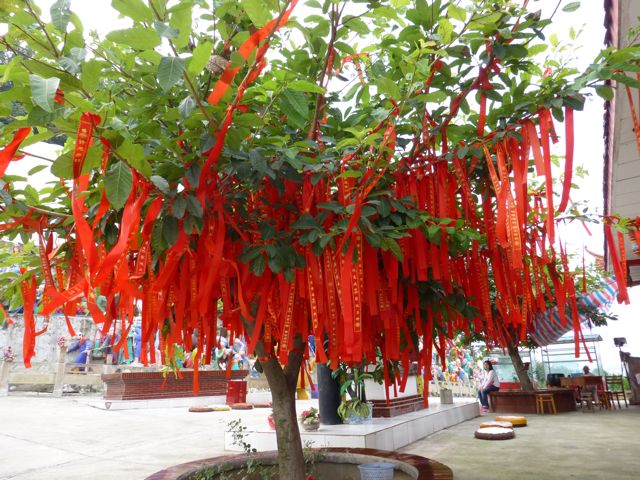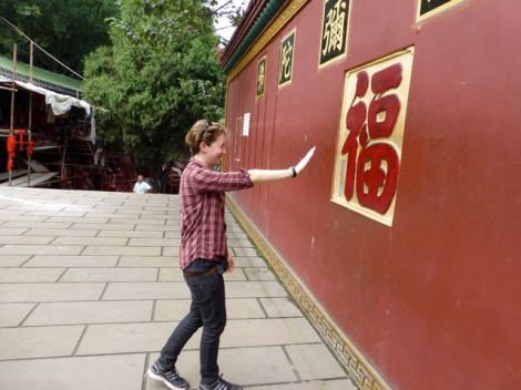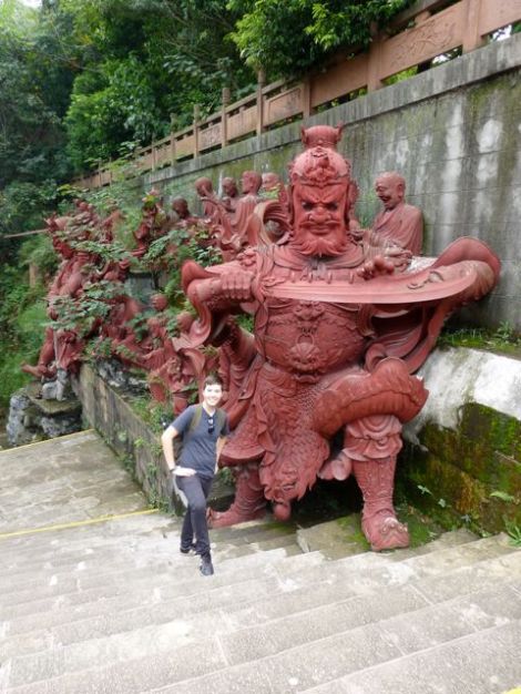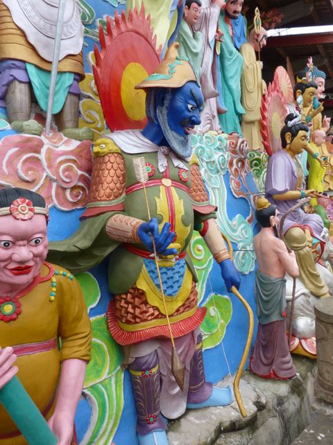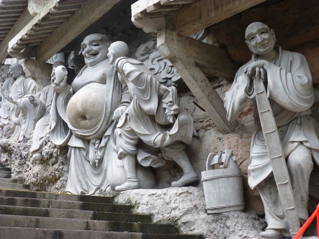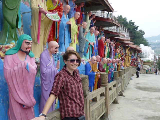 Mi found one called Bān Rè that is riding a donkey, with one hand in a fist, wearing red, and smiling. As we stood admiring the statue, a woman came by and offered to explain the story, for a price. Mi handed over 1 Yuan and listened as Erin translated the tale. The figure’s red robes are auspicious, the clenched fist means that he can hold onto any money that comes to him, the smile means that he will have much happiness in his life, and the donkey means that he will have assistance in carrying his burdens. According to the woman, who didn’t look like a nun but was associated with the temple in some way, this figure is the best one and the dreams of anyone who chooses it will come true if they do good things in their life.