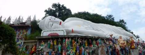 We then moved on to admire the piece-de-resistance, the Sleeping Buddha. This giant statue is one of the highlights of the temple. This humungous statue is brilliant white with red lips and dark eyes. It is lying on its side wearing robes and the expression of someone who just woke from a satisfying dream. Its absence of color looks all the more pure in stark contrast to the vibrantly painted luó hàn at its base.