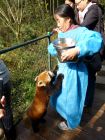 This keeper walked through the enclosure handing out bowls of food (apple slices and what looked like ground beef) to the hungry red pandas. As she walked from feeding platform to feeding platform, she called to them in Chinese (Ray translated and she was basically asking them to come down from wherever they were to get their lunch). This was a particularly eager red panda that decided that it couldn’t wait for her to bring the food to the viewing platform.
