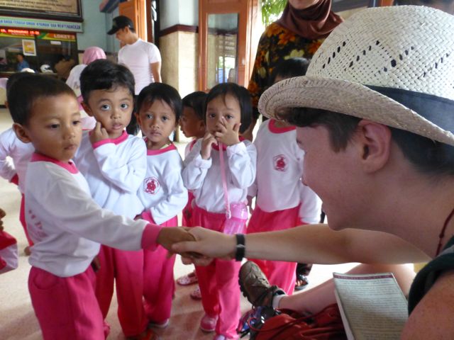 The next morning we headed to the train station and bought tickets to Probolinggo. We sat reading and talking to locals. Before long a hoard of children wearing bright pink pants flooded out of a bus to take a tour of the train station. They greeted all of the workers and of course were curious about us. Their teachers lined them up to shake our hands. This made them nervous but some were still brave enough to do as they were told.