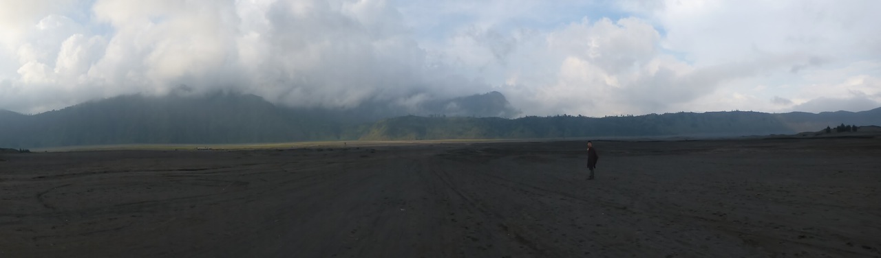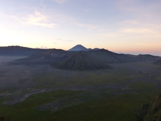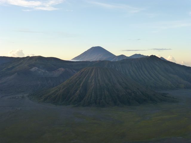 There are three volcanoes you can see from this viewpoint. The crater to the left is Mount Bromo. It is the shortest due to its frequent activity blowing off the top. The farthest is Mt Semeru, and the closest is Mount Batok. They are all active volcanoes, and can see the evidence of their recent lava flows on the valley floor.