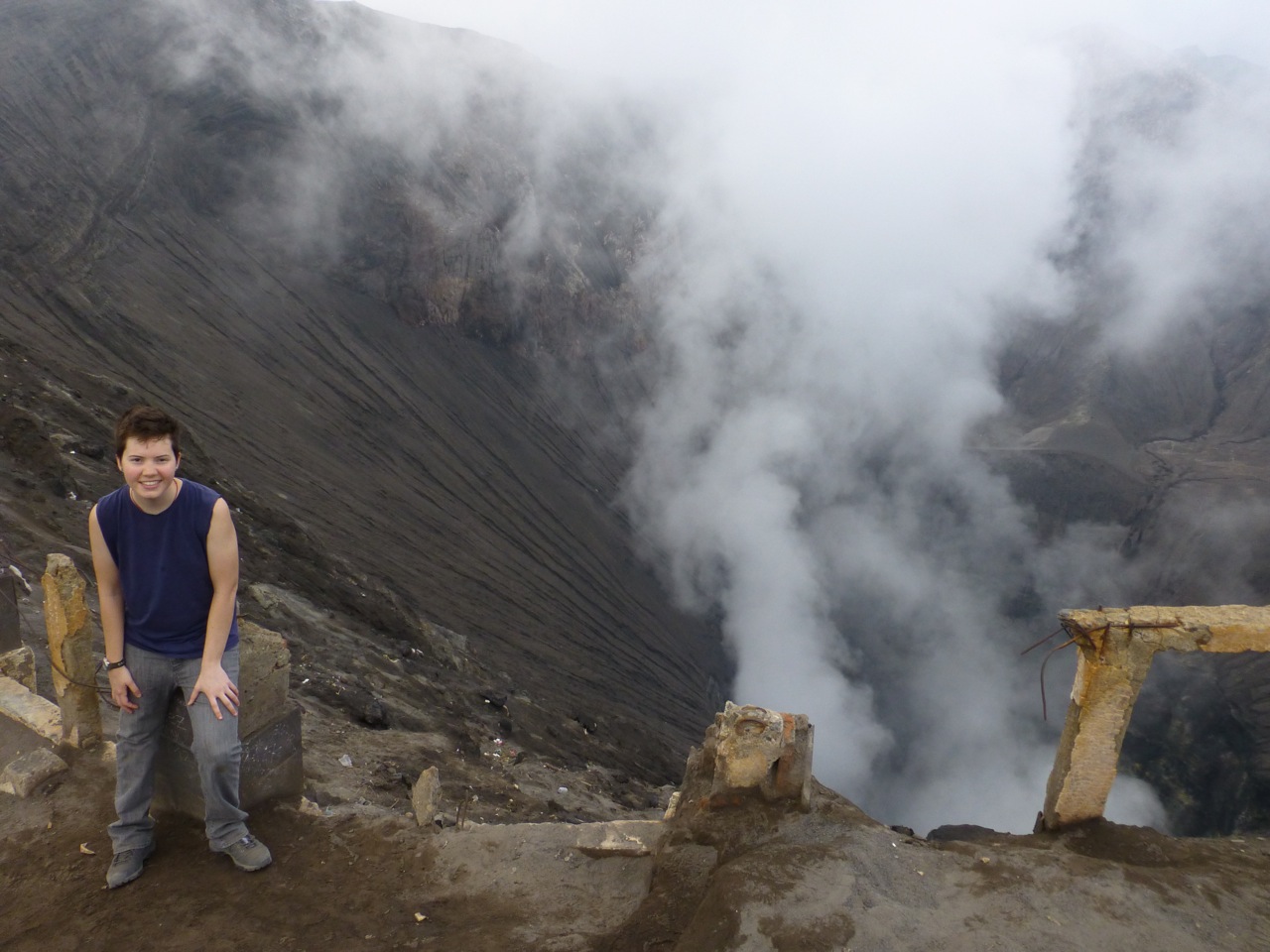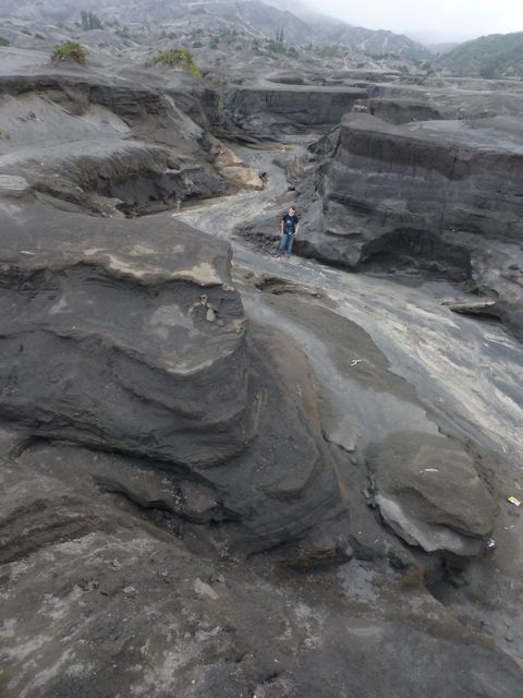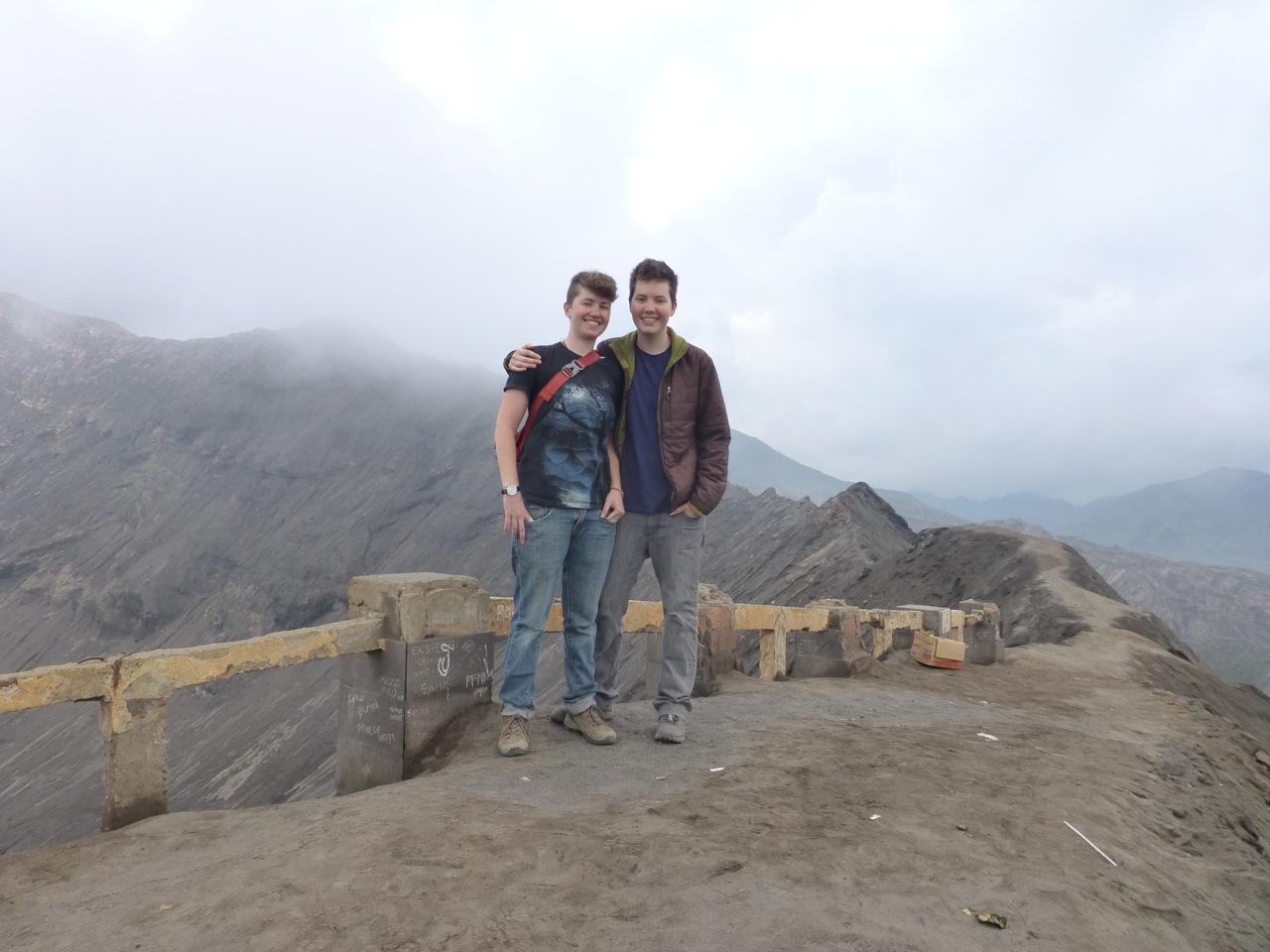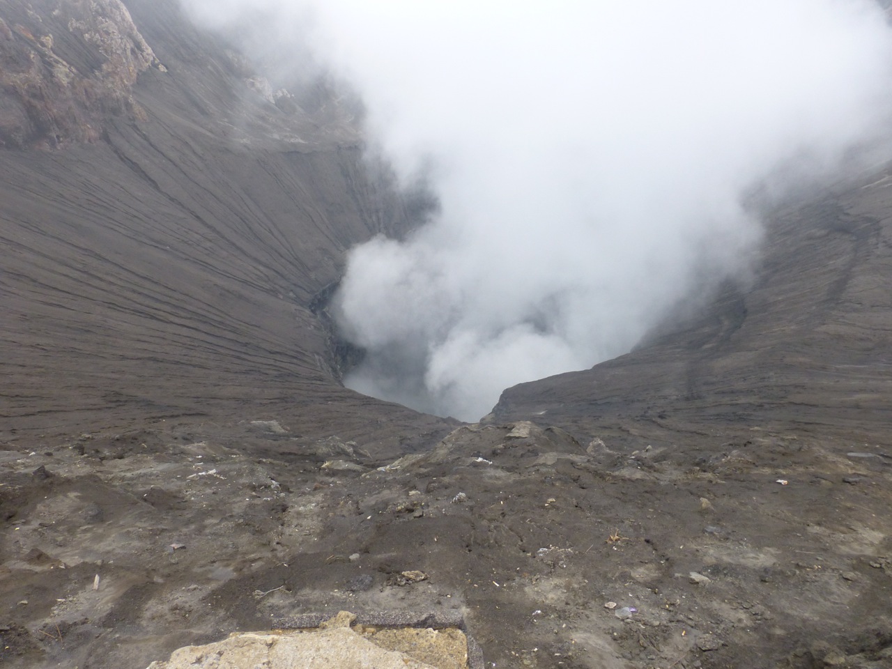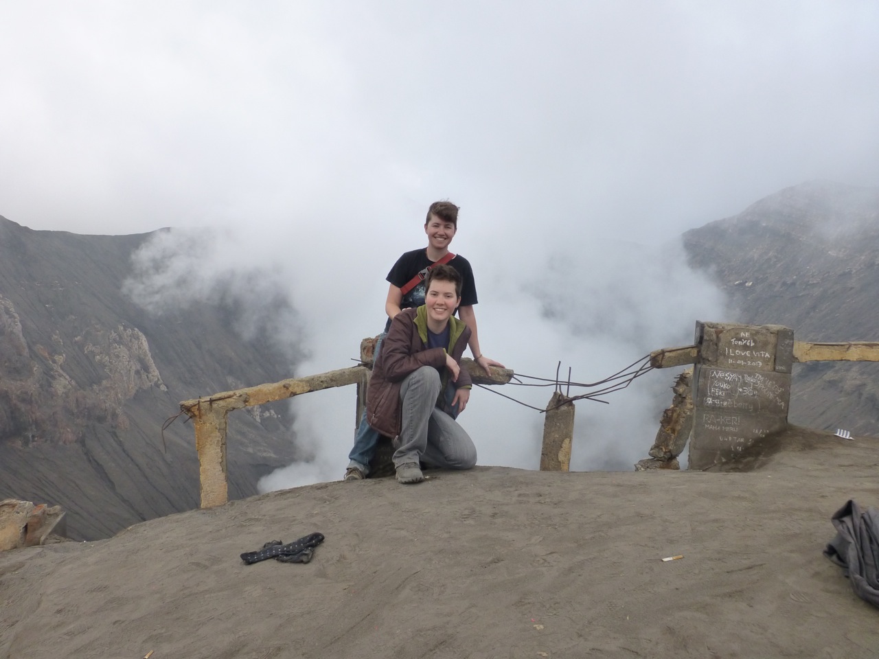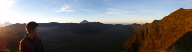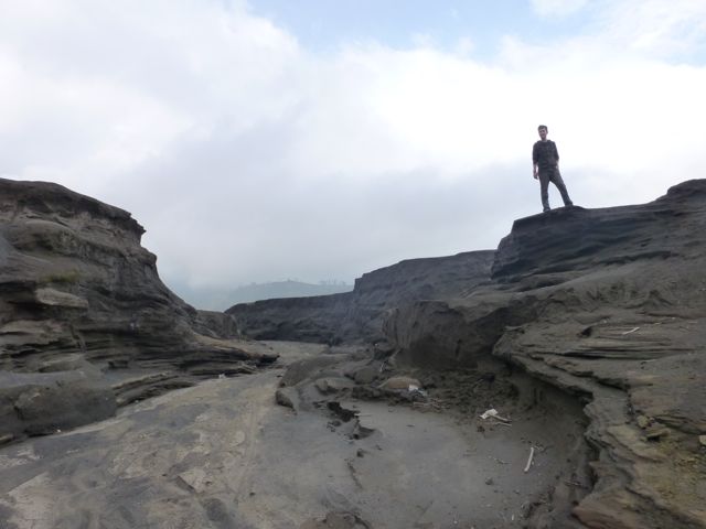 Every time we meet a huge staircase, we always count the number of steps. Our climb to the crater’s edge took us up 253 sandy stairs. Although it was not easy, we have climbed higher up to temples in China, which on several occasions were more than one thousand stairs. We were a little out of breath, which was made harder by the sulfuric smoke billowing from Bromo. We were a bit nervous to stand close to the edge because the guardrail was in a state of disrepair and the slope down to Bromo’s gullet did not look to have any handholds to prevent a slide which culminated in bubbling greenish liquid.