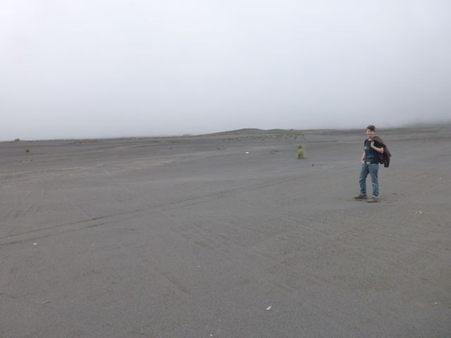 The hike was more like a relaxing stroll through the sandy plain until we reached the bottom of the volcano. It was like walking on another planet. The thick mist kept us cool and shrouded the horizon, giving it a distinct other-worldly atmosphere.
