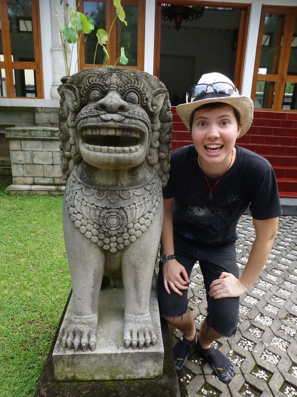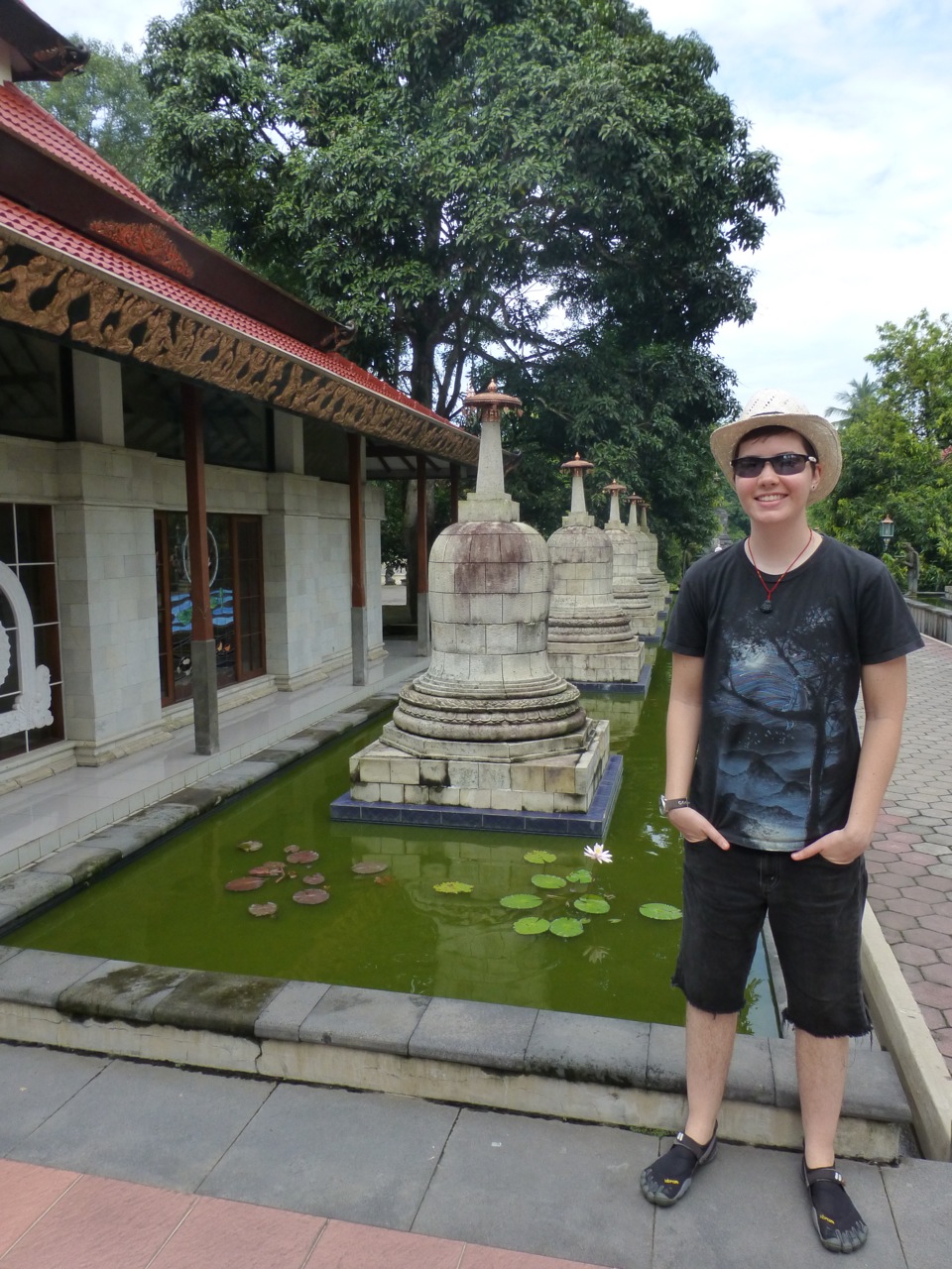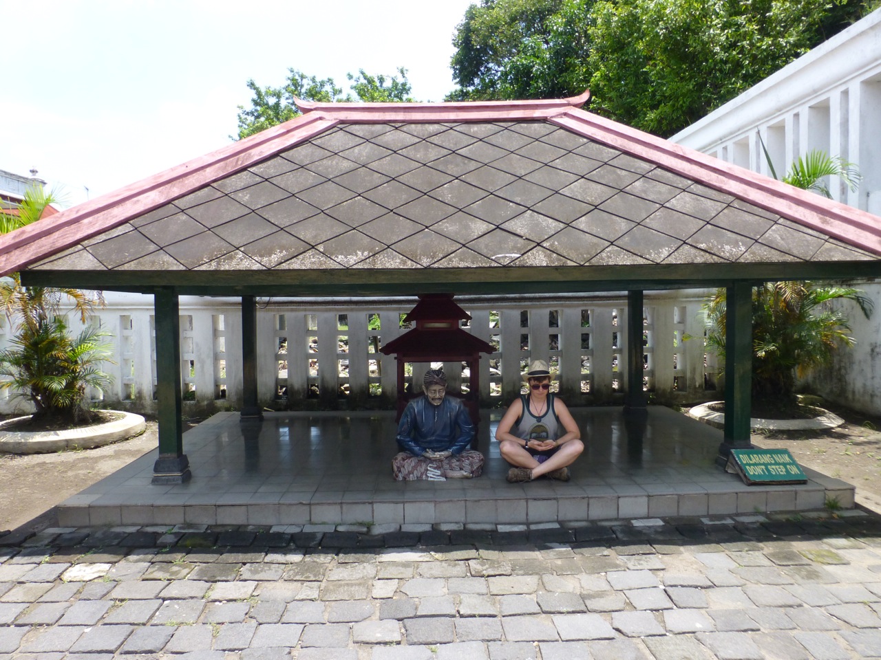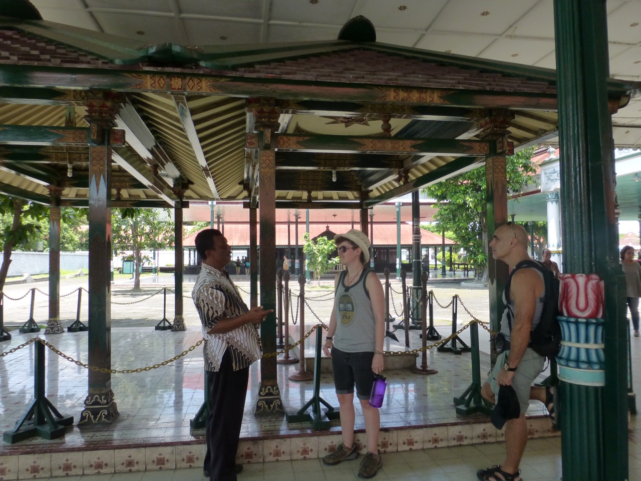 In Yogyakarta (pronounced Jokjiakarta) we set out to explore the city center. Our hostel was located just off of the Main drag, Jalan Malioboro; we were in the heart of the city. We went to a travel agency and booked a tour to Borobudur and Prambanan for the following day. At that travel agency we met an Isreali American who spent 20 years in NYC and recently moved back to Isreal before traveling. We met him in his sixth month of exploration. We all headed down to the 246-year-old Sultan’s Palace, called Kraton. The colors on the pillars represent 3 religions. The green represents Islam, the pink lotus flower Buddhism, and the turquoise represents Hinduism.