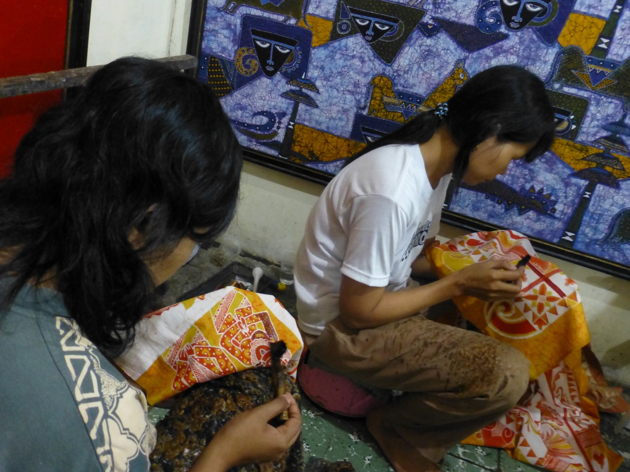 From the palace we took a horse and buggy to a workshop to learn how Batik textiles are made. Using wax-resisting dyeing methods, people create artistic tapestries with a series of bees wax patterns, and dyeing the cloth multiple times. The base color is always yellow, and they go darker from there. The more colors in a tapestry, the more times they have had to dye it.