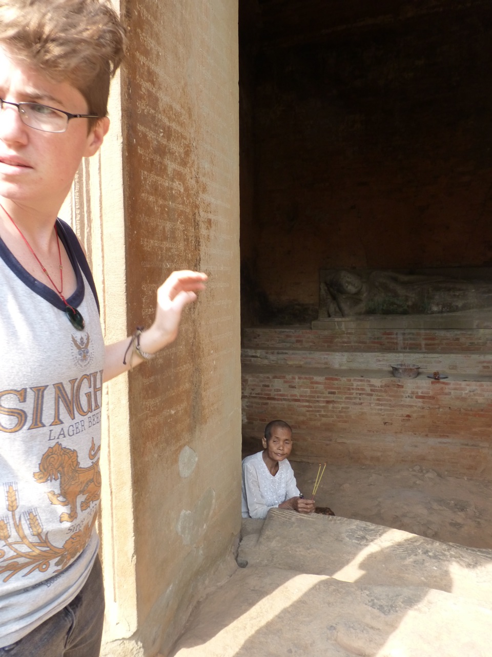 We climbed up a ladder-like staircase to find a lone Buddhist offering incense to paying customers.
