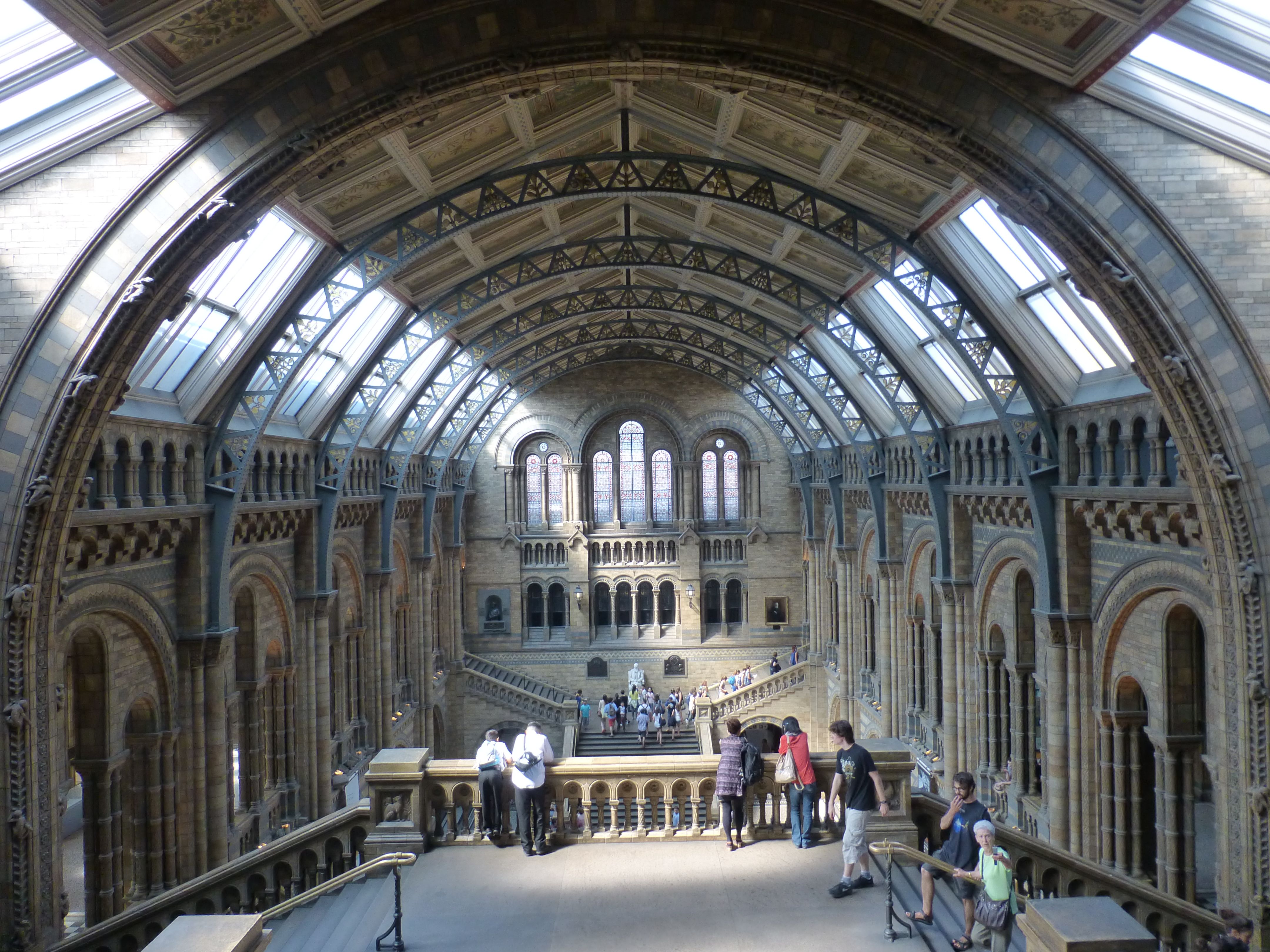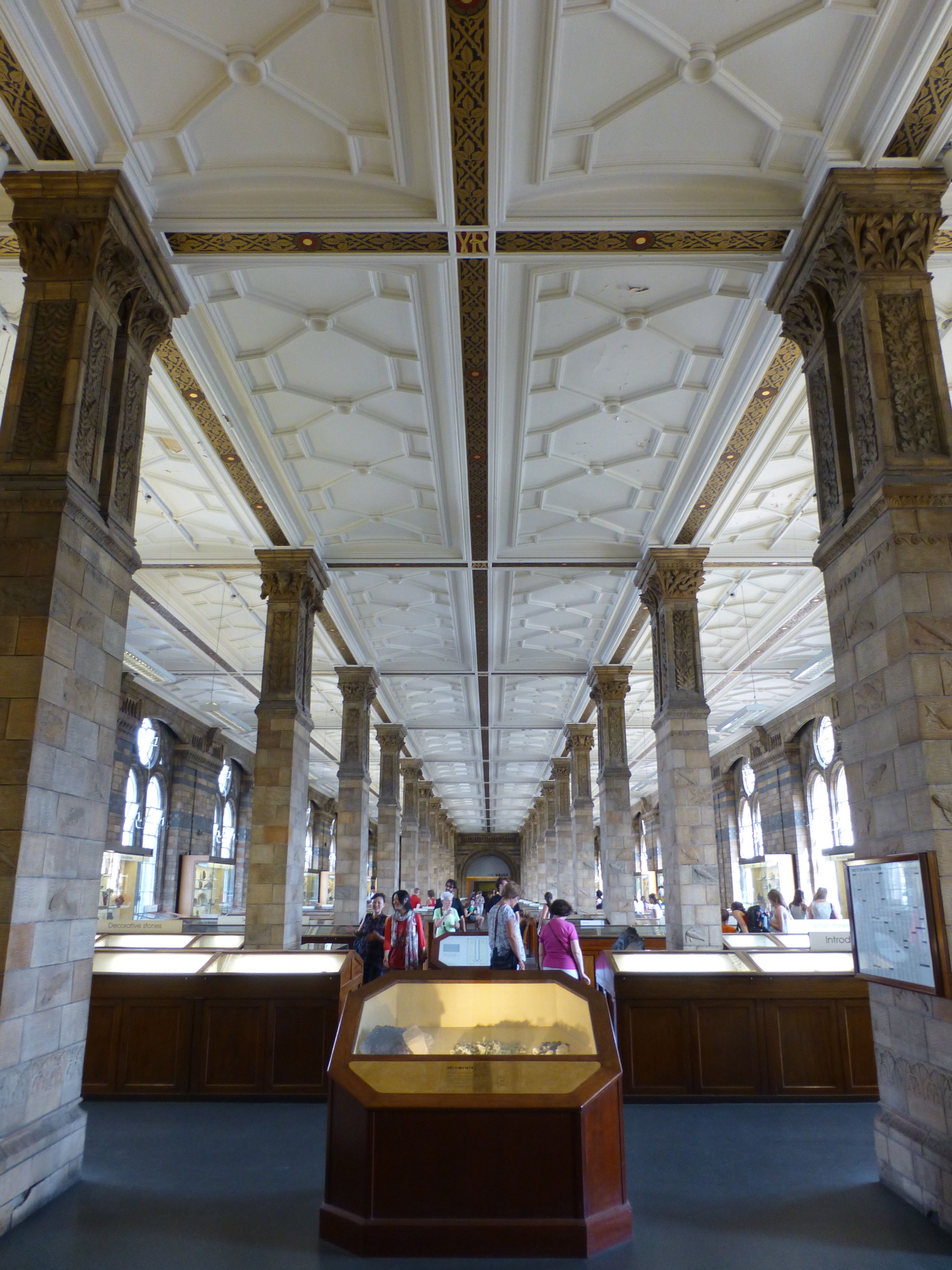 The vaulted ceilings are lined with carvings of animals and the skylights illuminate the statue of Charles Darwin on the opposite side of this grand room.