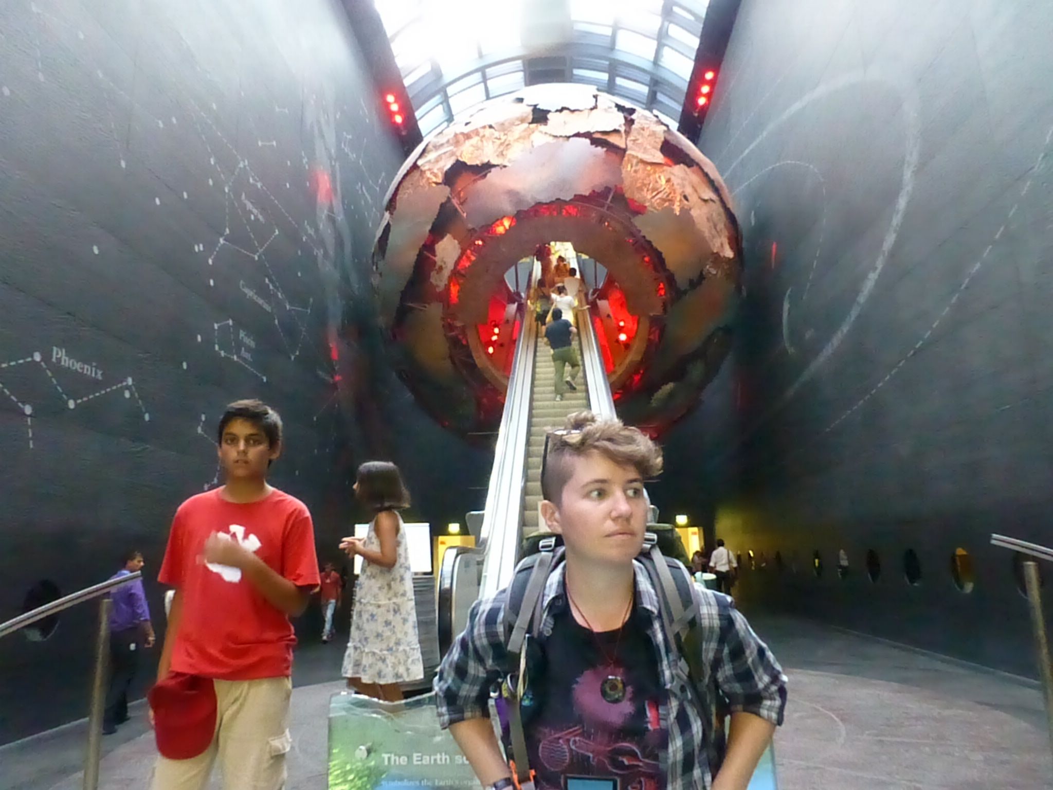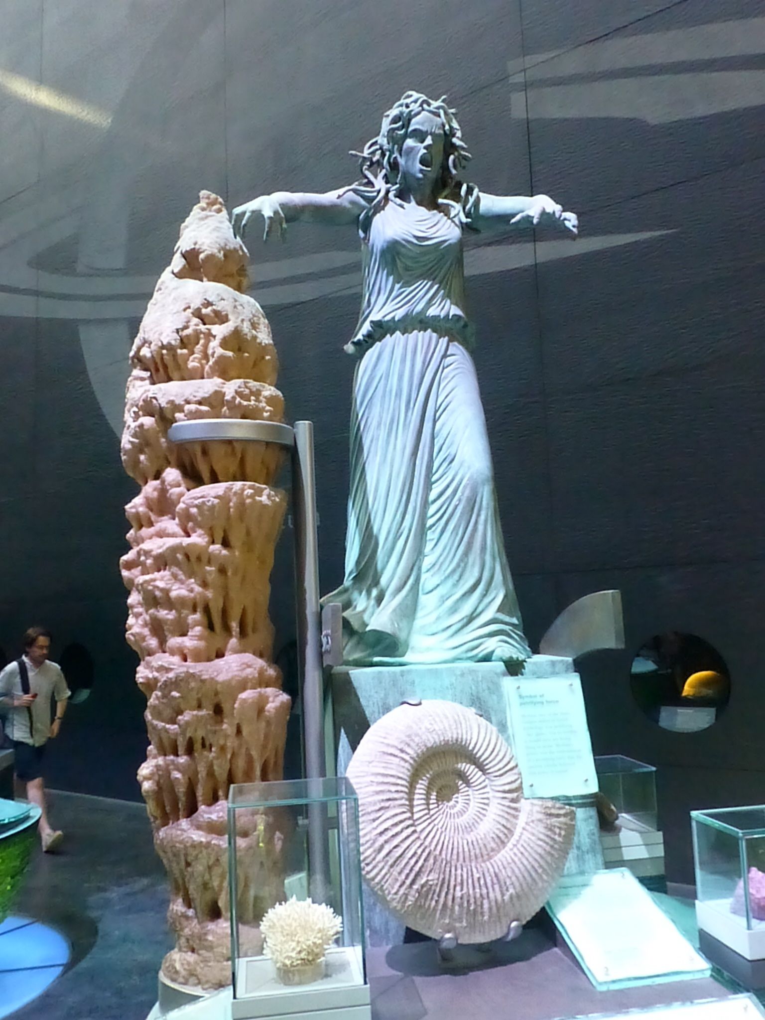 The entrance to the “Red Zone” section about earth and the natural forces that shape our planet is excellent. There are statues that represent myths that are related to natural processes like mineralization that turns organic materials into stone, like Medusa. There is also a statue of Cyclops, which is one of Mi’s favorite stories because it is possibly based on peoples’ misinterpretations about finding pygmy elephant skulls. The skulls have a large nasal cavity in the middle of the forehead, which could easily be misconstrued as an eye socket. The pygmy elephant’s short tusks could have looked like enlarged fangs.