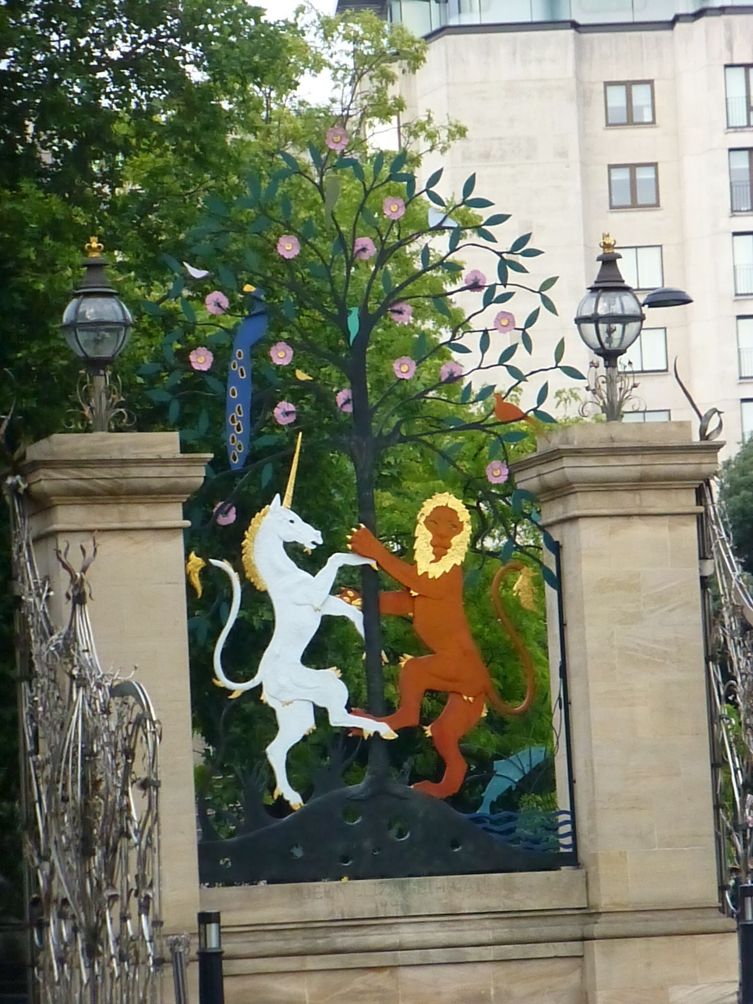 Queen’s Gate to Hyde Park with the lion and the unicorn, which are heraldic symbols of the United Kingdom.
