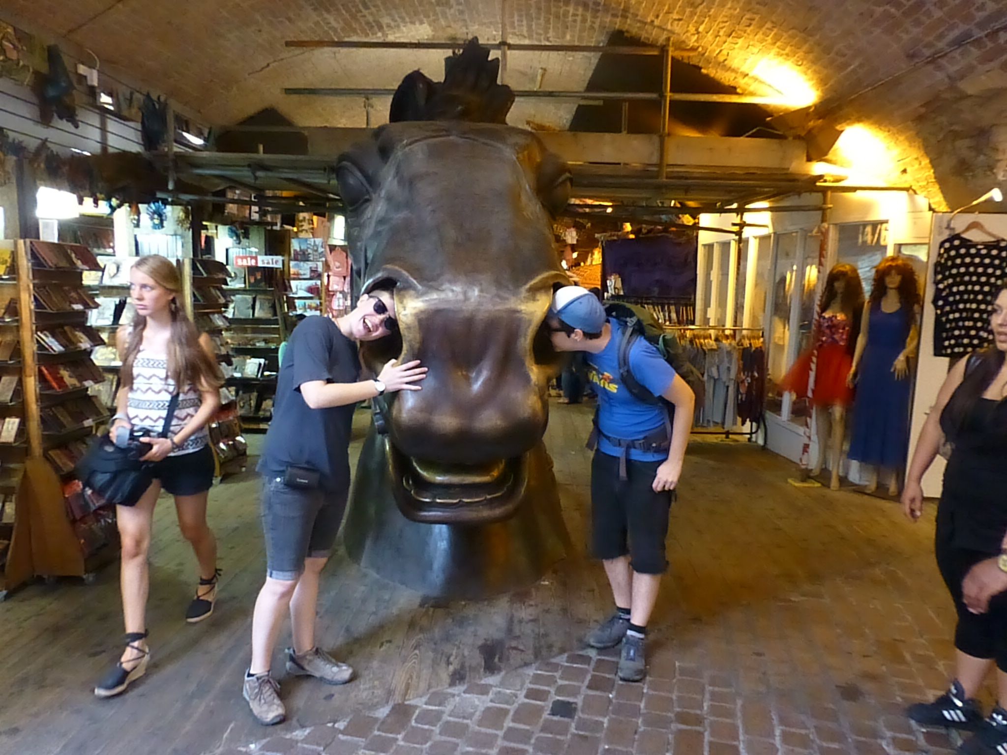 An old horse hospital has been turned into a trendy market where you can buy anything from clothes to street food. Everywhere are large steel horse statues. This one is so big we could put our heads in its nostrils.