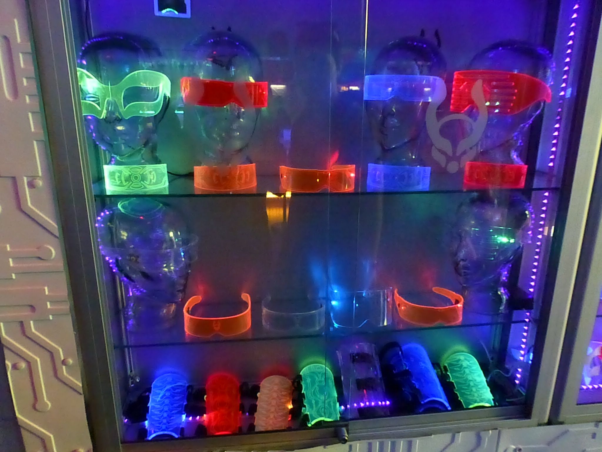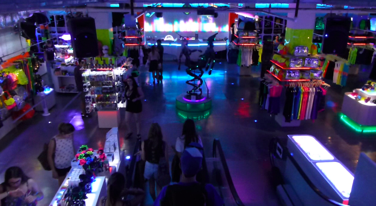 This store is for rave gear. When you walk inside drum and bass music is blasting and black lights made our teeth glow. Futuristic robot decorations, glasses, and costumes adorned every surface.