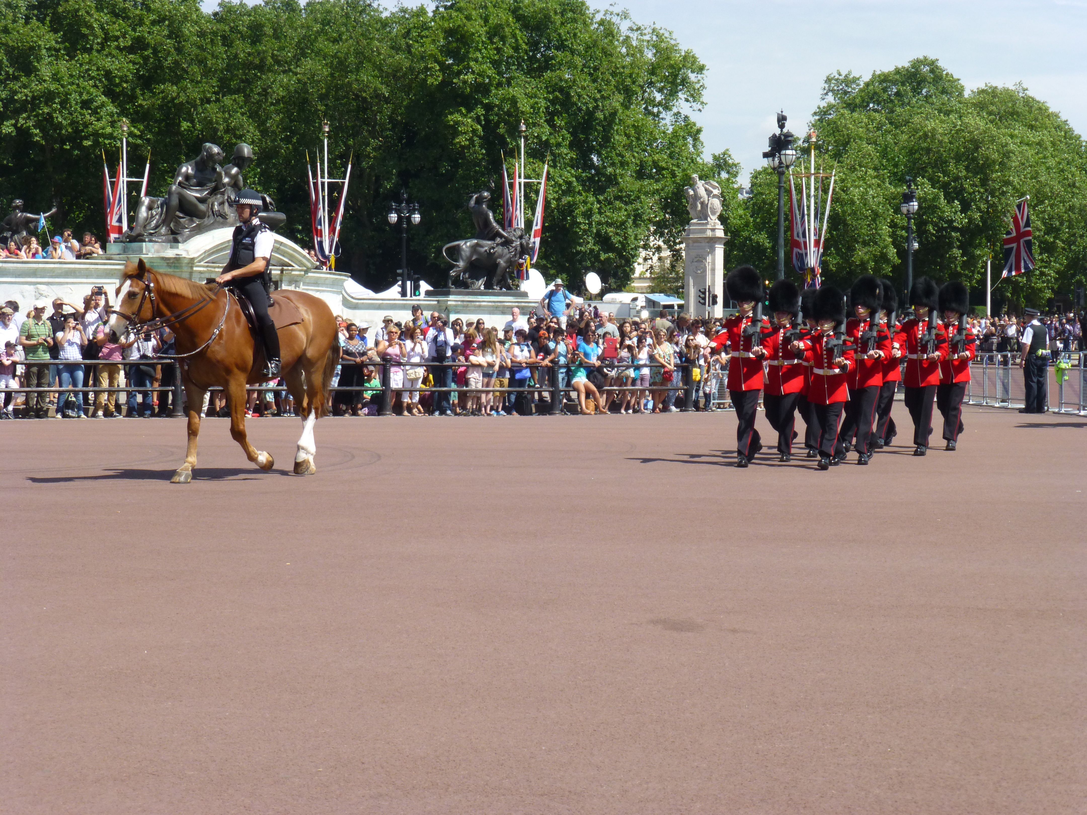 Image We believe that everyday is crowded while the Changing of the Guards occurs, but because the Royal Baby was just born it was even more crowded than usual. This woman cop on her incredibly beautiful horse was also a highlight of our morning. Image Image We managed to get a decent spot to watch the band and guards march to and from the Palace gates. Image