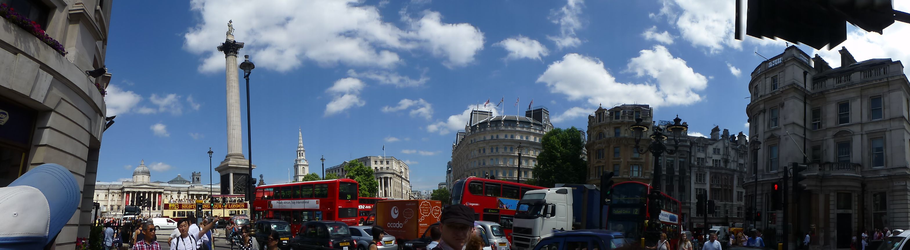 A panoramic shot of Trafalgar Square. It’s a bustling part of the city where it is of upmost importance to pay attention of the cross walk signals.