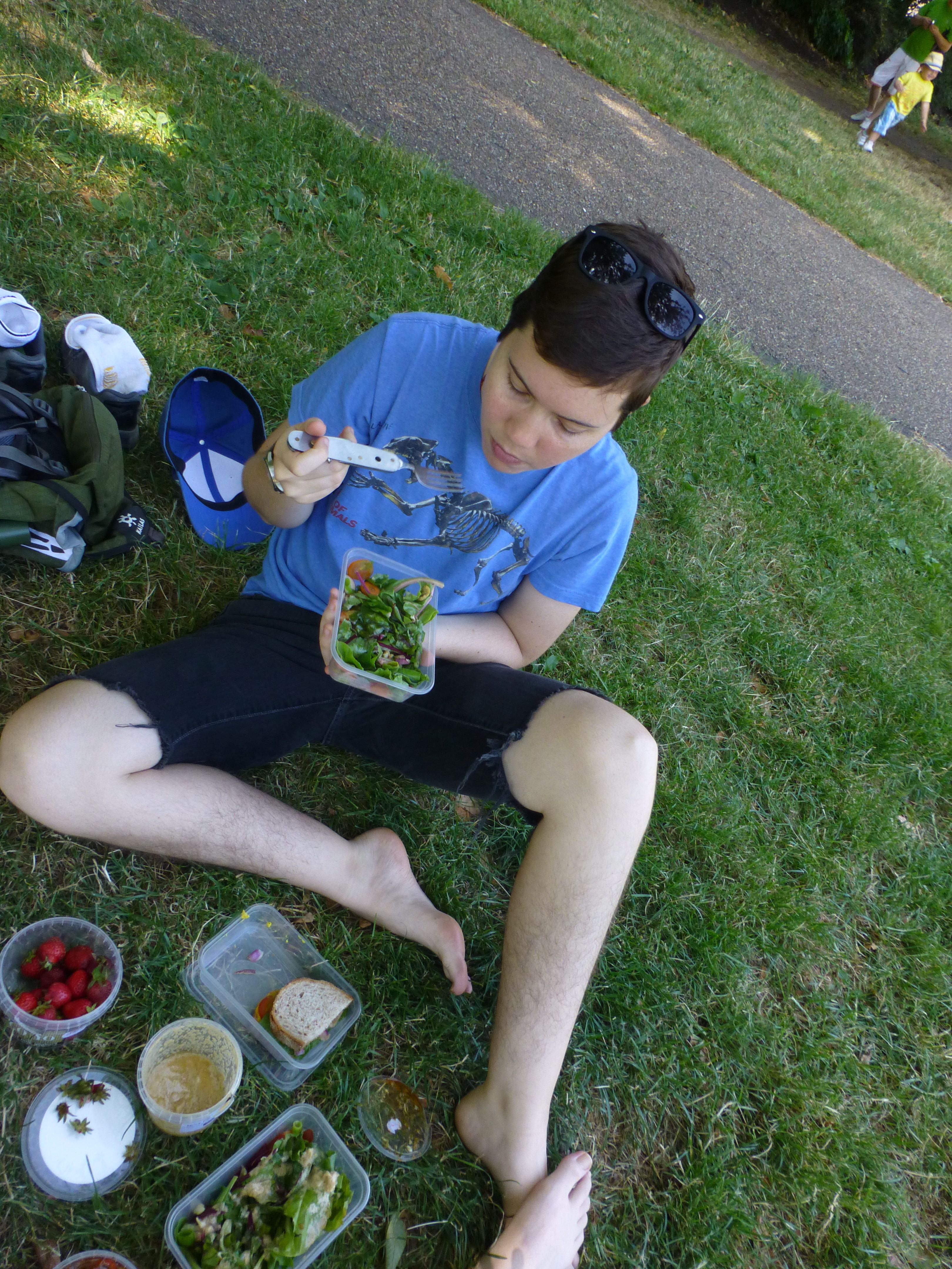 Afterwards we went back to the courtyard and had a picnic. We have gotten pretty good at shopping at the farmer’s market and packing excellent lunches, which are not only delicious but save us money. We have been having mouthwatering sandwiches on fresh bread with organic ingredients. Mi even got marmite to put on the sandwiches.