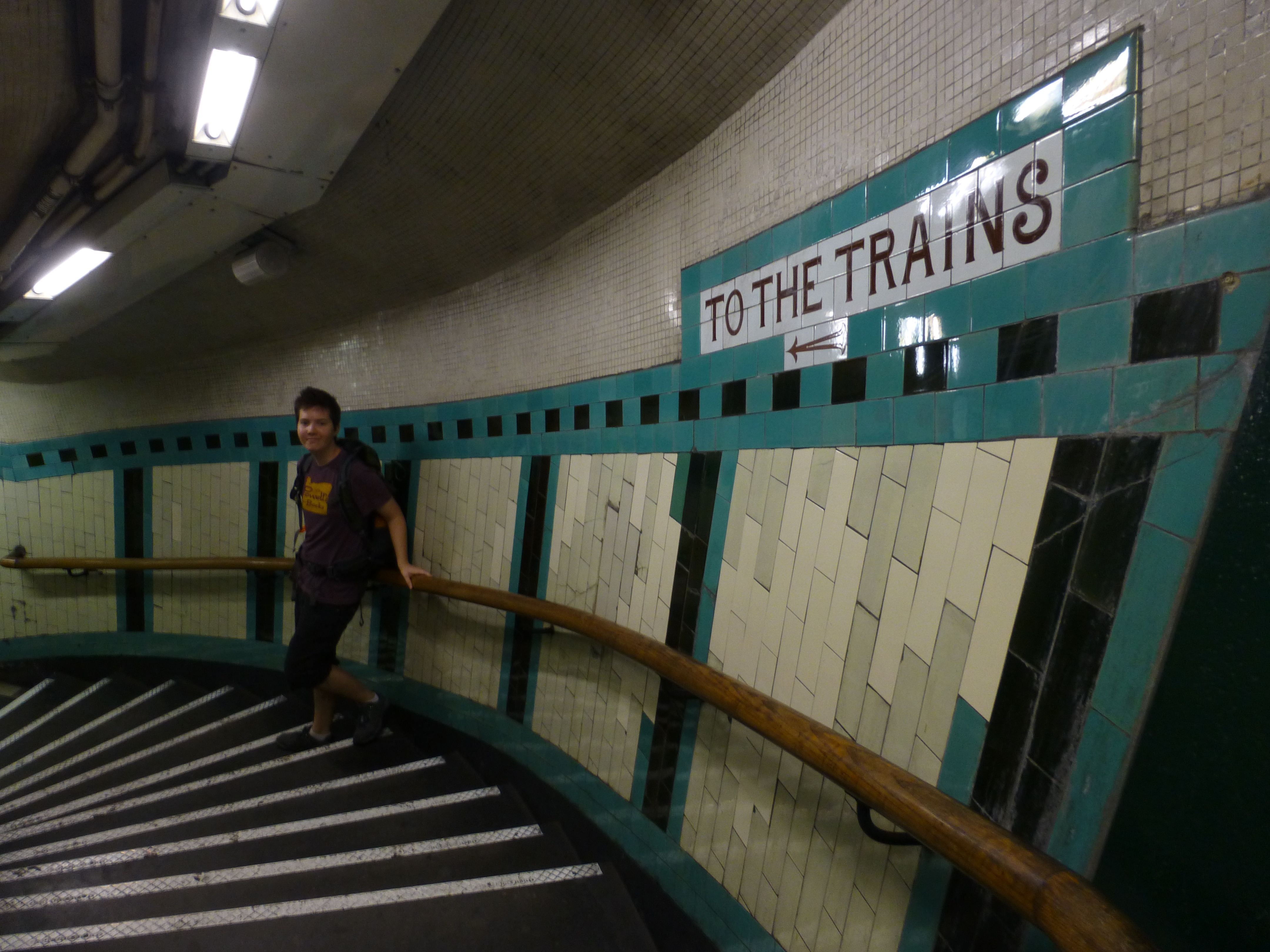 This train station at Russell Square in Camden had spiral stair cases to the platform. An announcement stated that the 175 stairs from the platform to ground level were the equivalent of a 13 story building. We took them down because the lift queue was miles long.