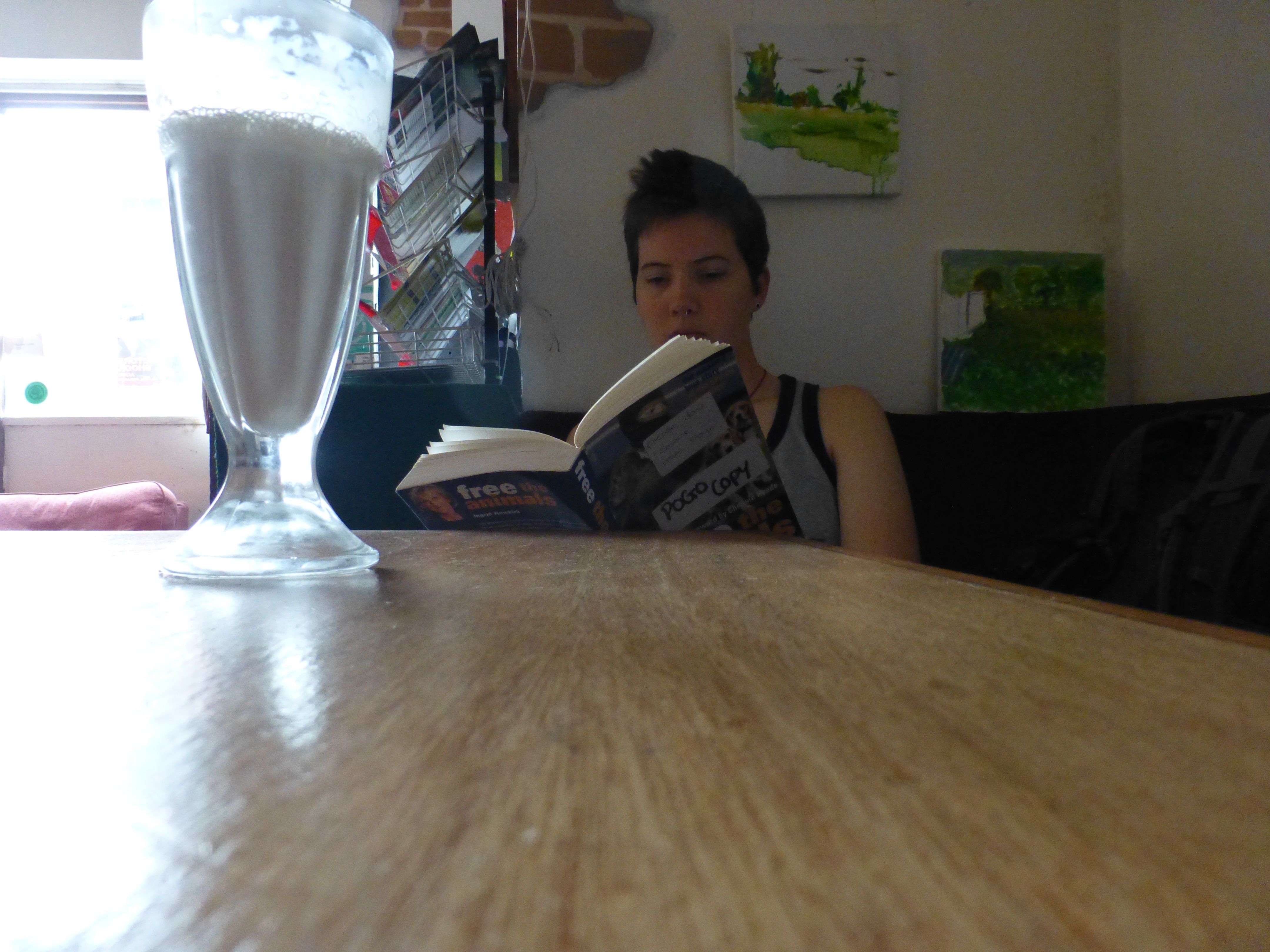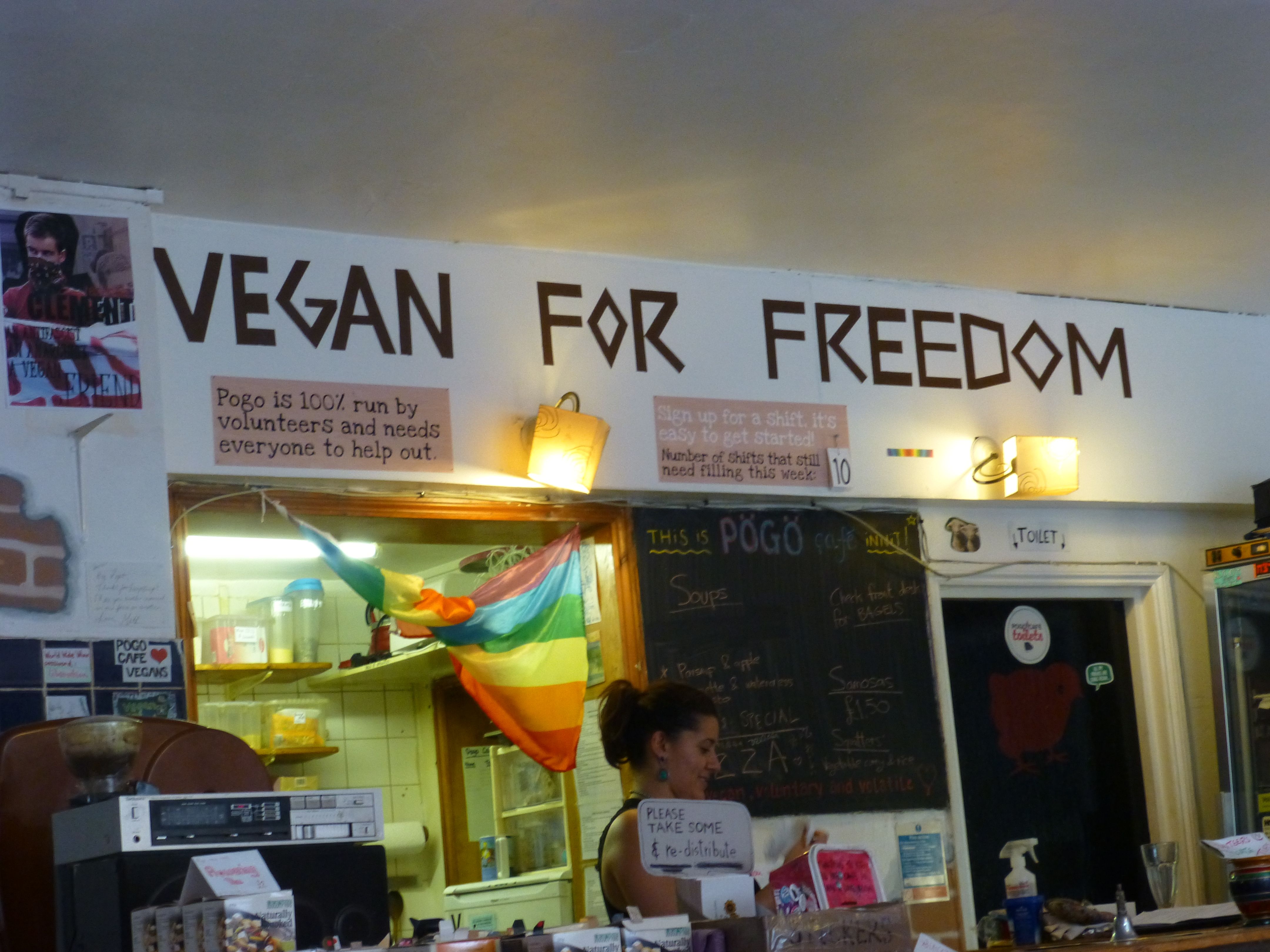 The next day we had one goal: to find a tasty vegan restaurant. We met that goal and surpassed it at the Pogo Cafe in Hackney. This is a cooperative run entirely by volunteers. It is autonomous, non-hierarchical, and affordable. Not only was the food tasty and completely vegan, but the restaurant also provides information and a place to be with like minded people. They have free movie screenings, activism opportunities, and board games. After we finished our “punk burgers” and “milkshakes,” we basked in the community space occupied by people whose goals are to liberate animals and live in harmony with all creatures. We grabbed books from their library to read while we digested. It was a thoroughly enjoyable experience.