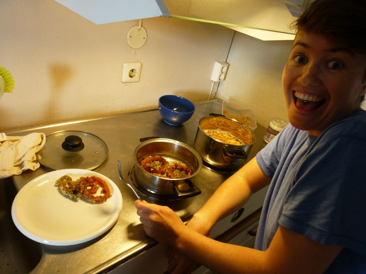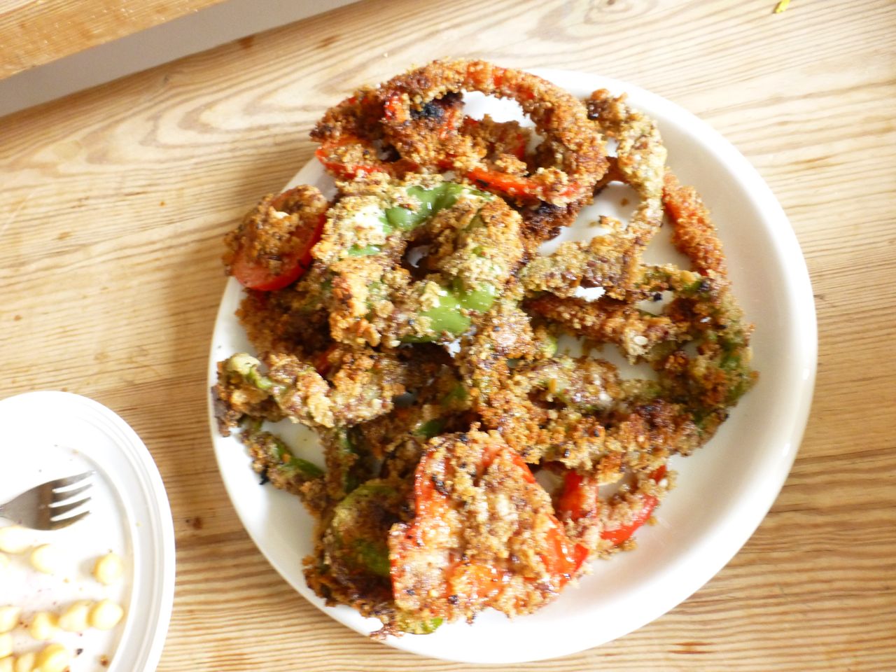 We made ourselves fried green tomatoes, red and green peppers to celebrate my homecoming.