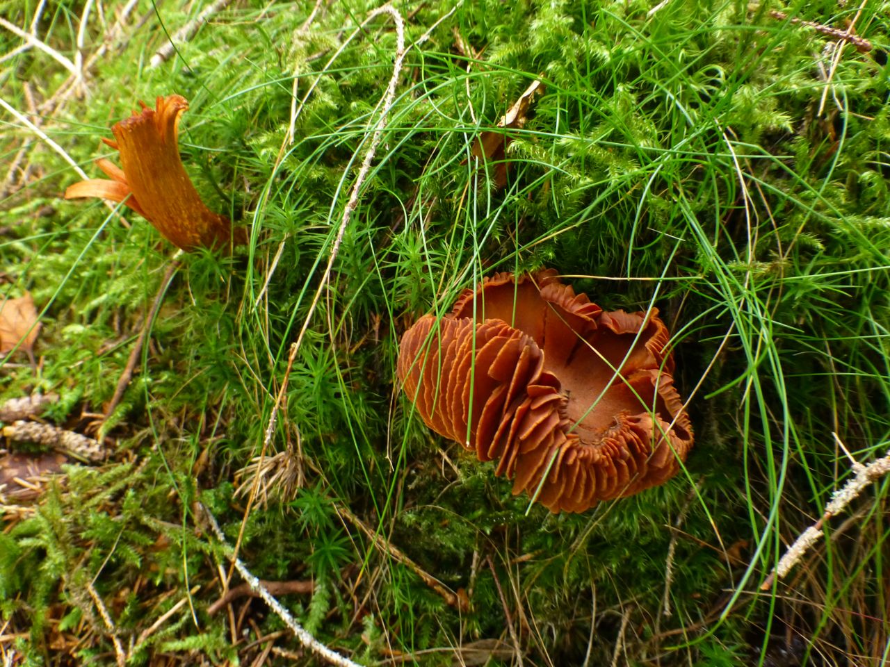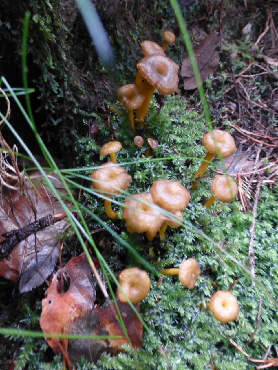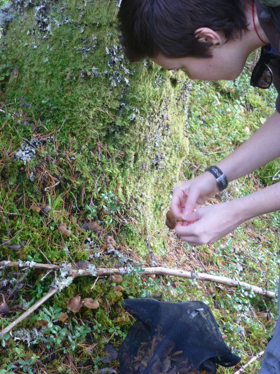 This type of mushroom is often found in pine forests amongst the moss. It is a yellowish mushroom with a hollow stem and a hole in its cap. The underside of the cap has veins rather than gills. They can be found in groups so when one stumbles upon a few, it is likely to find many more nearby. Amusingly, the mushroom book that we borrowed from Gerd describes this variety as “gregarious.” Each of these characteristics distinguish it from less palatable and potentially dangerous mushrooms. Nevertheless, when we get home from “a hunt” we lay them all out on newspaper and spend hours meticulously cleaning off any remaining detritus, detaching the occasional hitchhiking slugs or worms, and inspecting each one to ensure that it is safe to eat.
