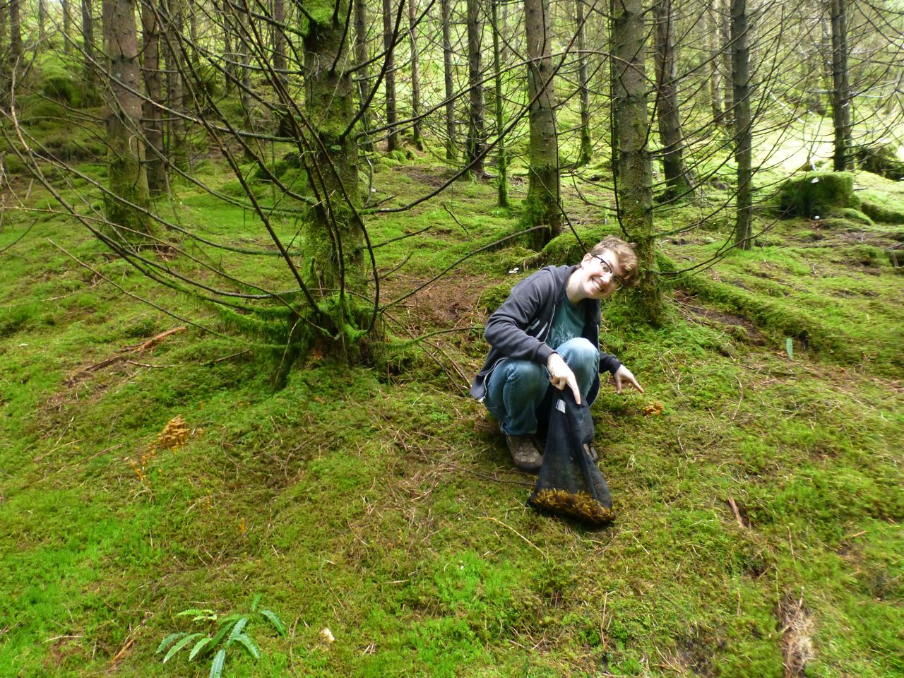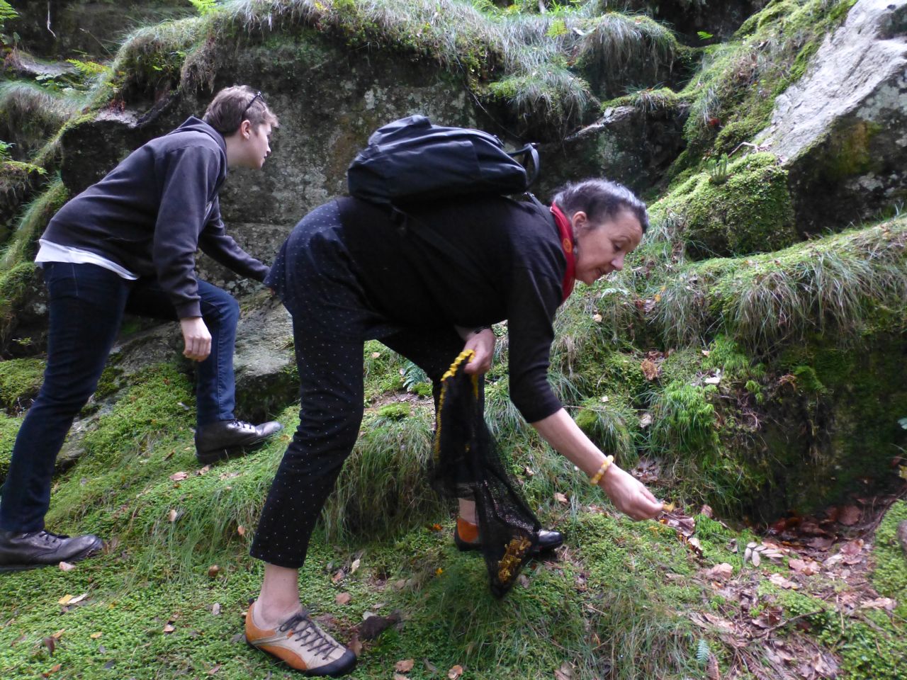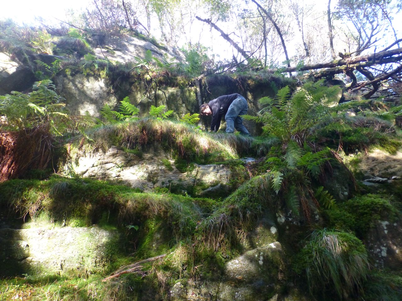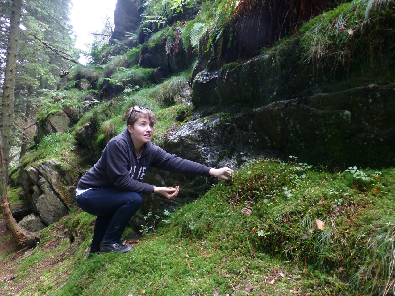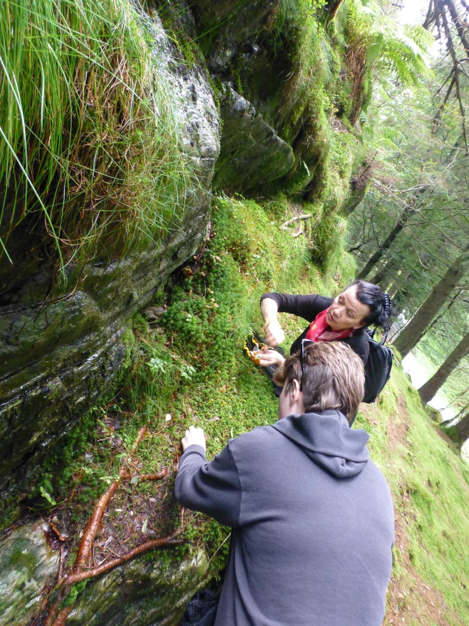 Our “prey” likes to grow on small hills, especially near boulders, so Kelly carefully climbed up the slick rocks to investigate.