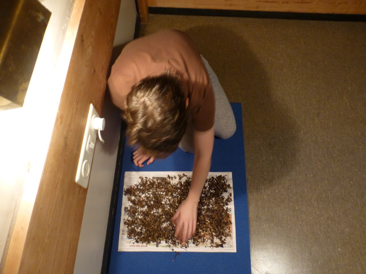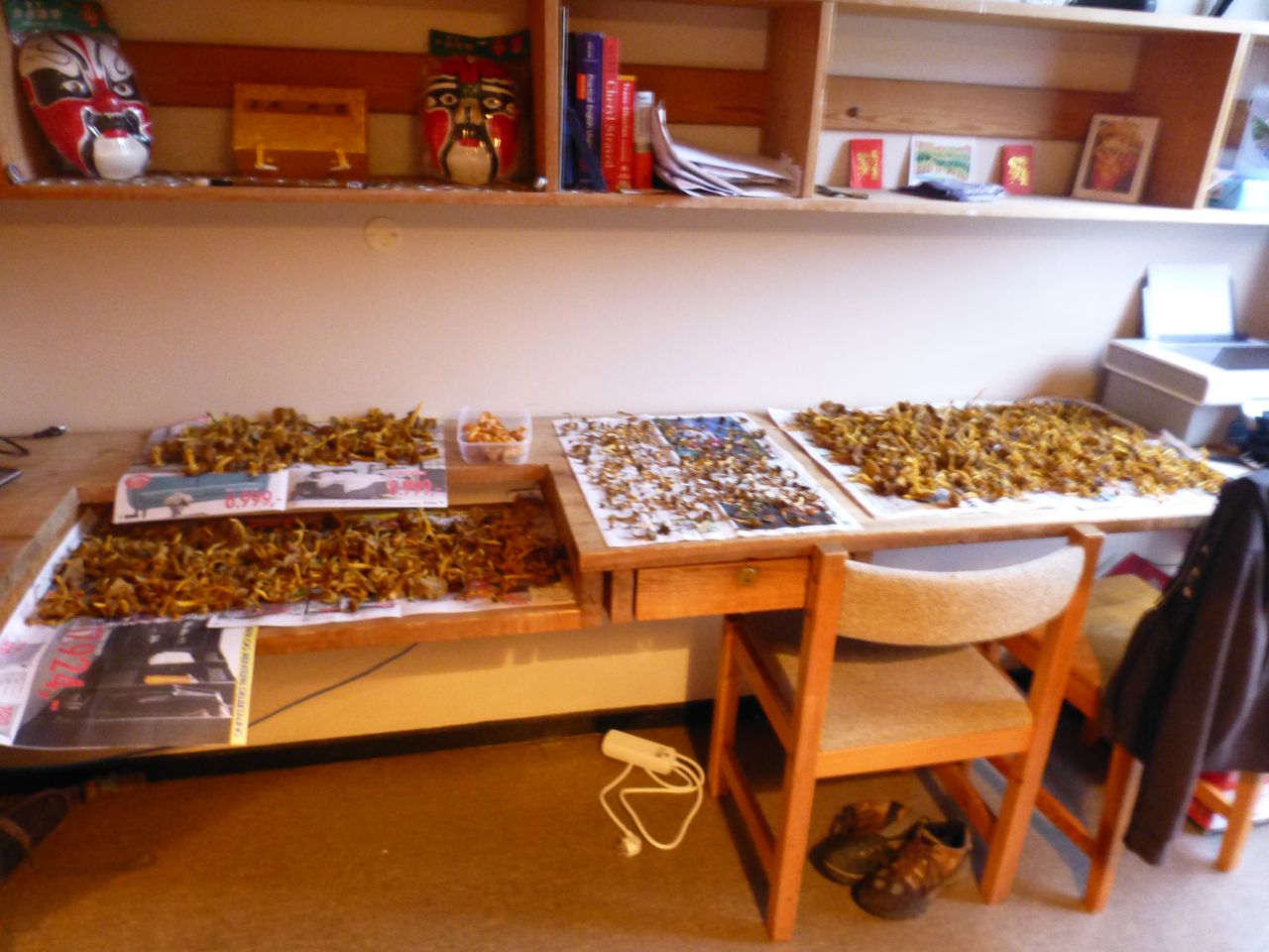 A week or two later, this is what all our hard work looks like. As they dry, the mushrooms shrink to roughly a quarter of their original size, making our hours of work look meager and shriveled. After a few trips, the surfaces of our living room were covered with mushrooms laid out on newspaper and the air was filled with their unique smell. First, the room smelled damp and earthy. As the mushrooms dried they smelled like dog feet.