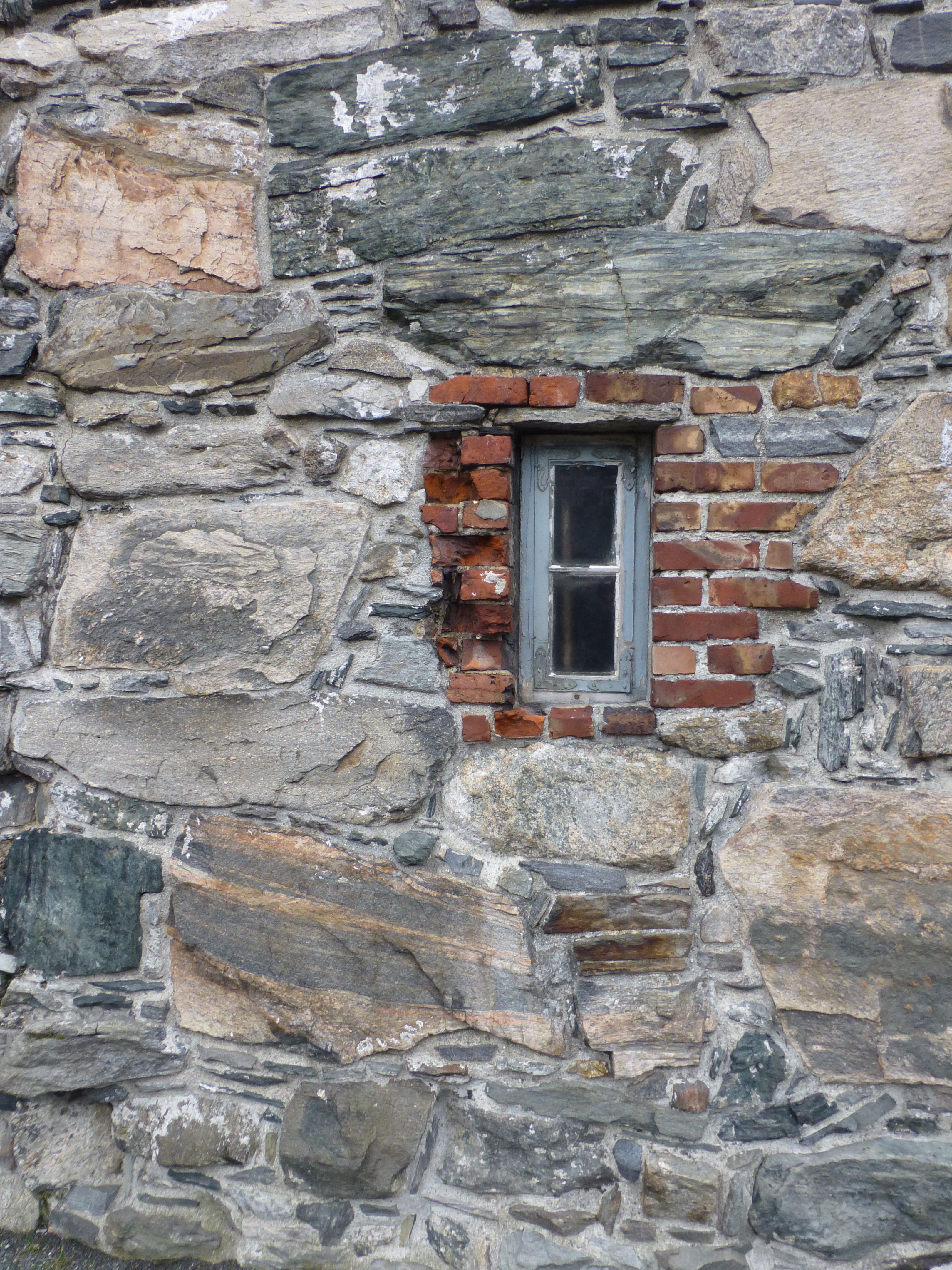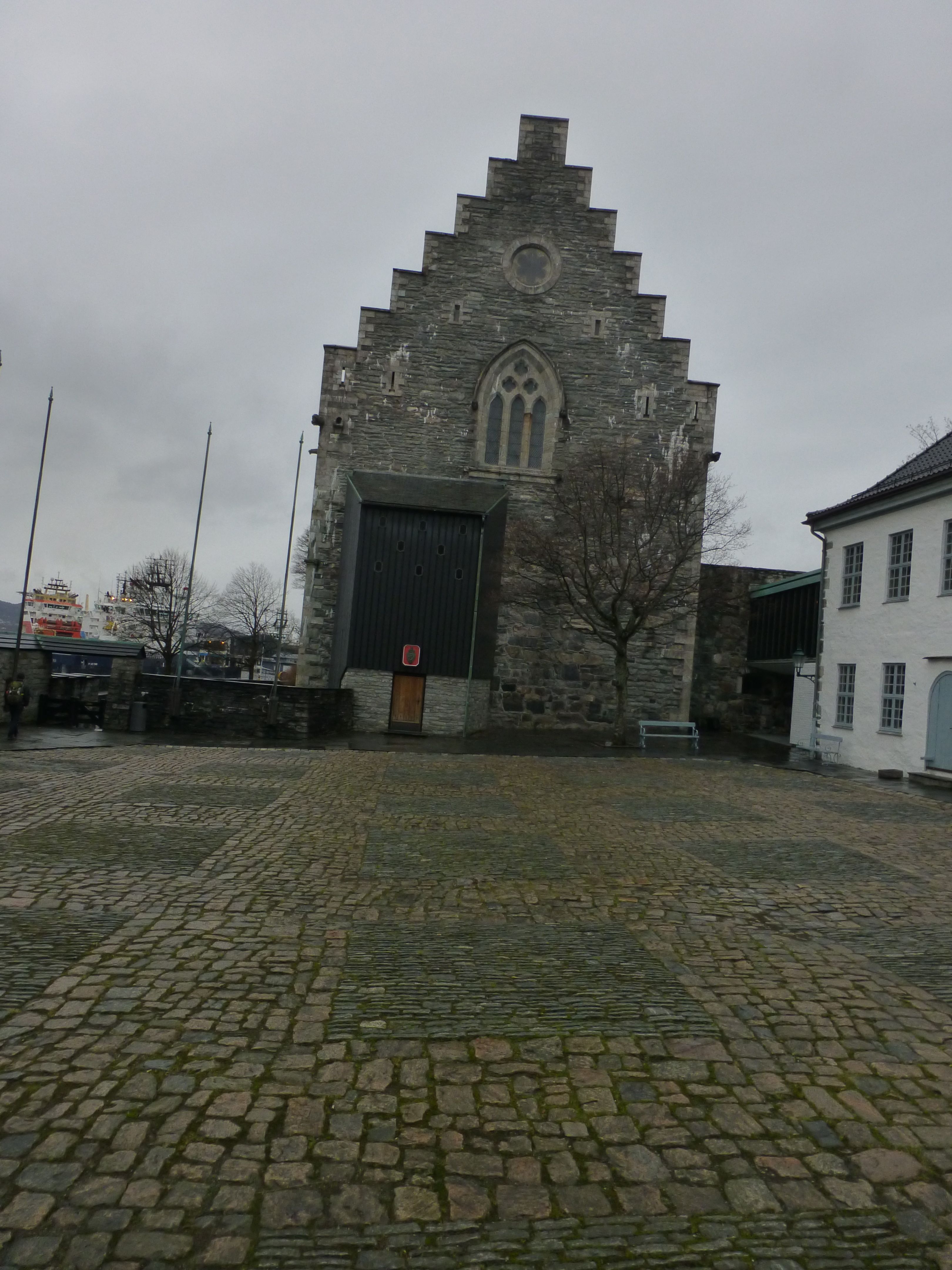 This is Haaken’s Hall, which was constructed in the middle of the 13th century and is the largest secular medieval building in Norway. It was closed this time but Mi went inside during a previous visit to admire this sturdy 3-story Gothic style stone building, which is thought to have been designed by English architects because it is an unusual style for Norway at that time. This structure was built for King Håkon Håkonsson to be his feast hall, so the primary floor is a wide open great hall lined with stained glass windows, with a middle floor and cellar below. Now it is sometimes used for events like chamber music concerts and official banquets. As you can see in the upper left hand side of this photo, these days the harbor is often choked by large ships, including cruise ships, which not only obscure the landscape and seem anachronistic in a photo of medieval buildings, but also pollute what was once pristine crisp northern air, smearing the sky above the harbor with a brown haze.