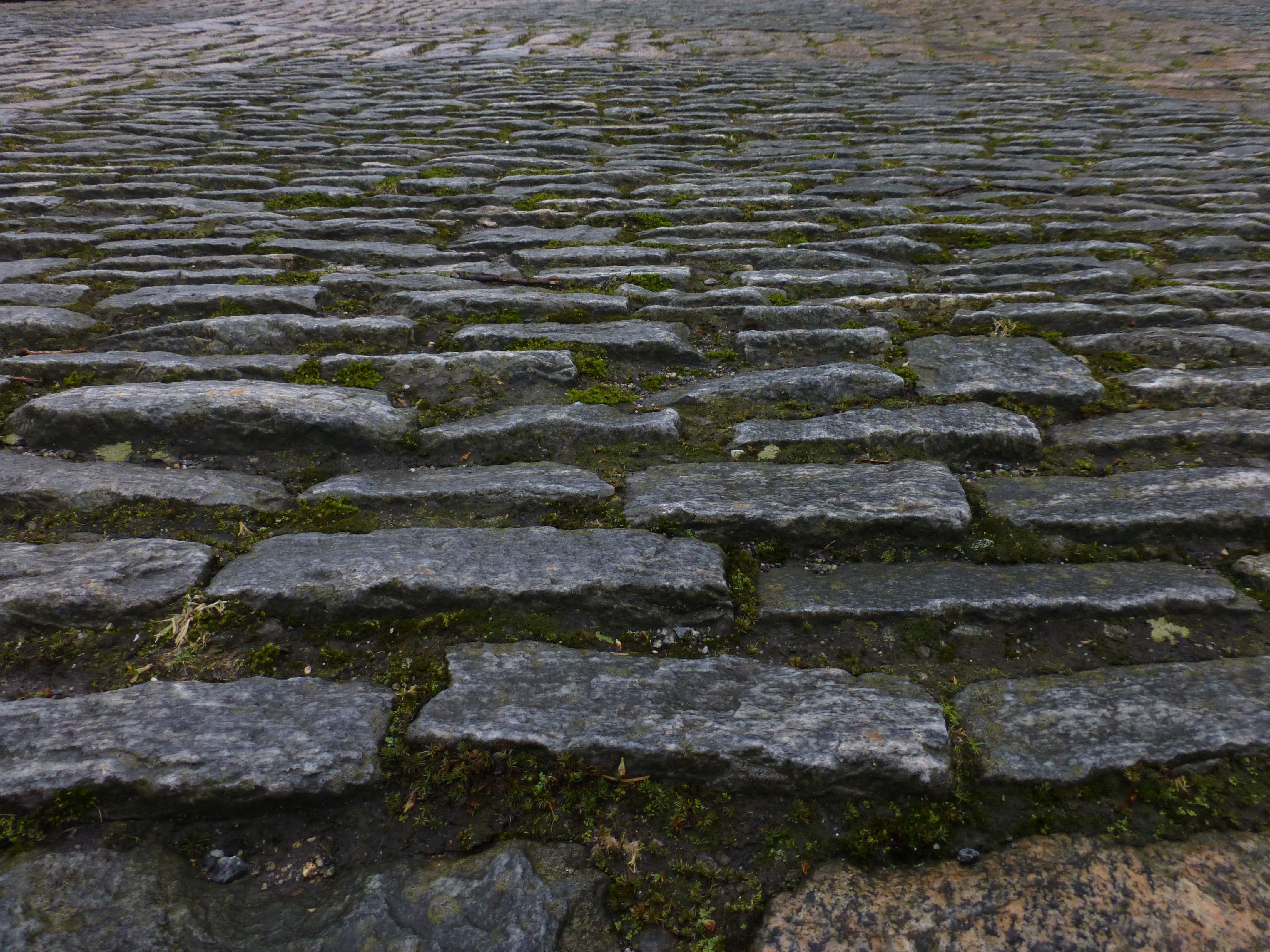 Kelly loves the cobblestone streets and walkways that can be found all over Bergen. Mi likes the moss.