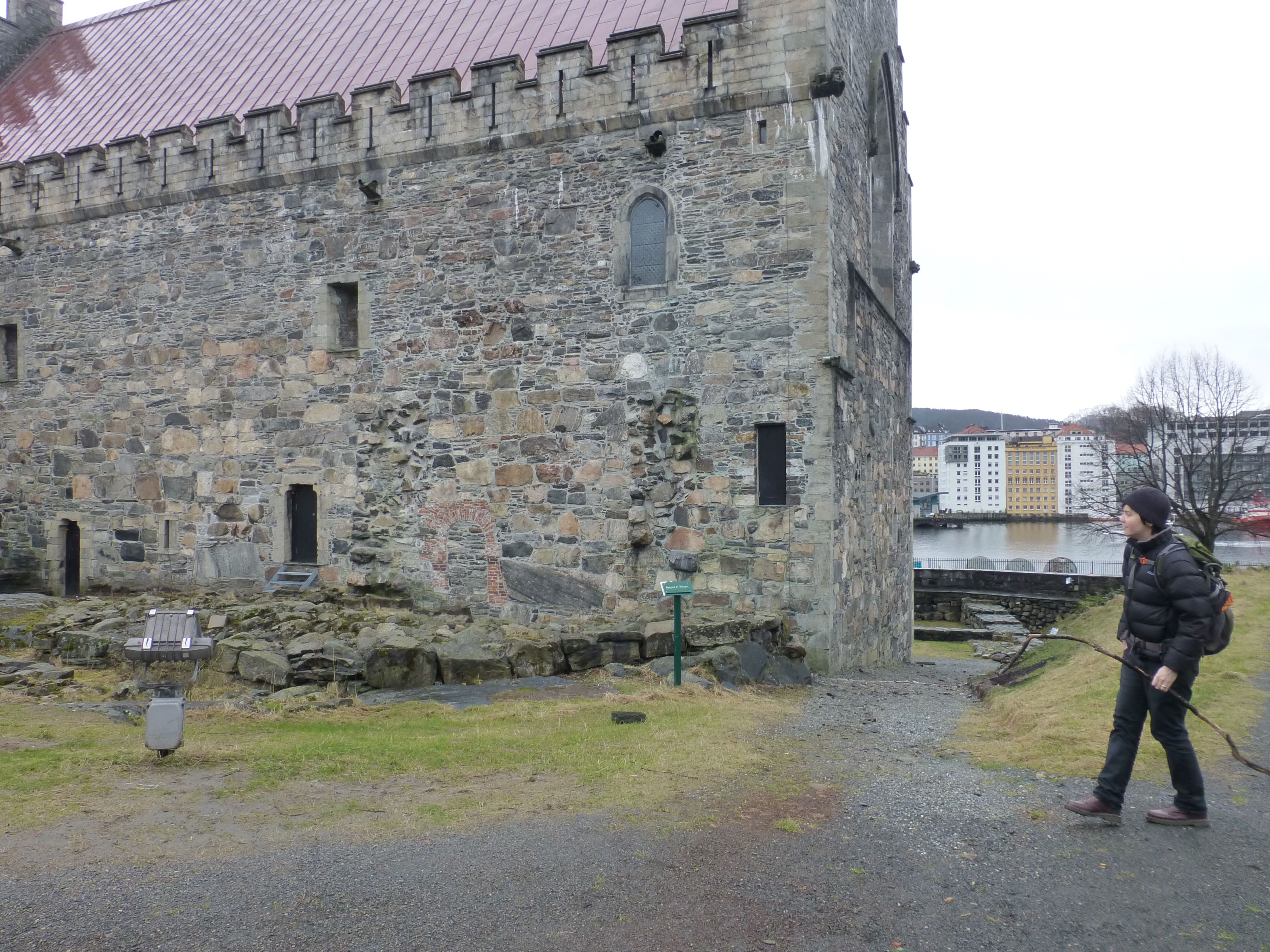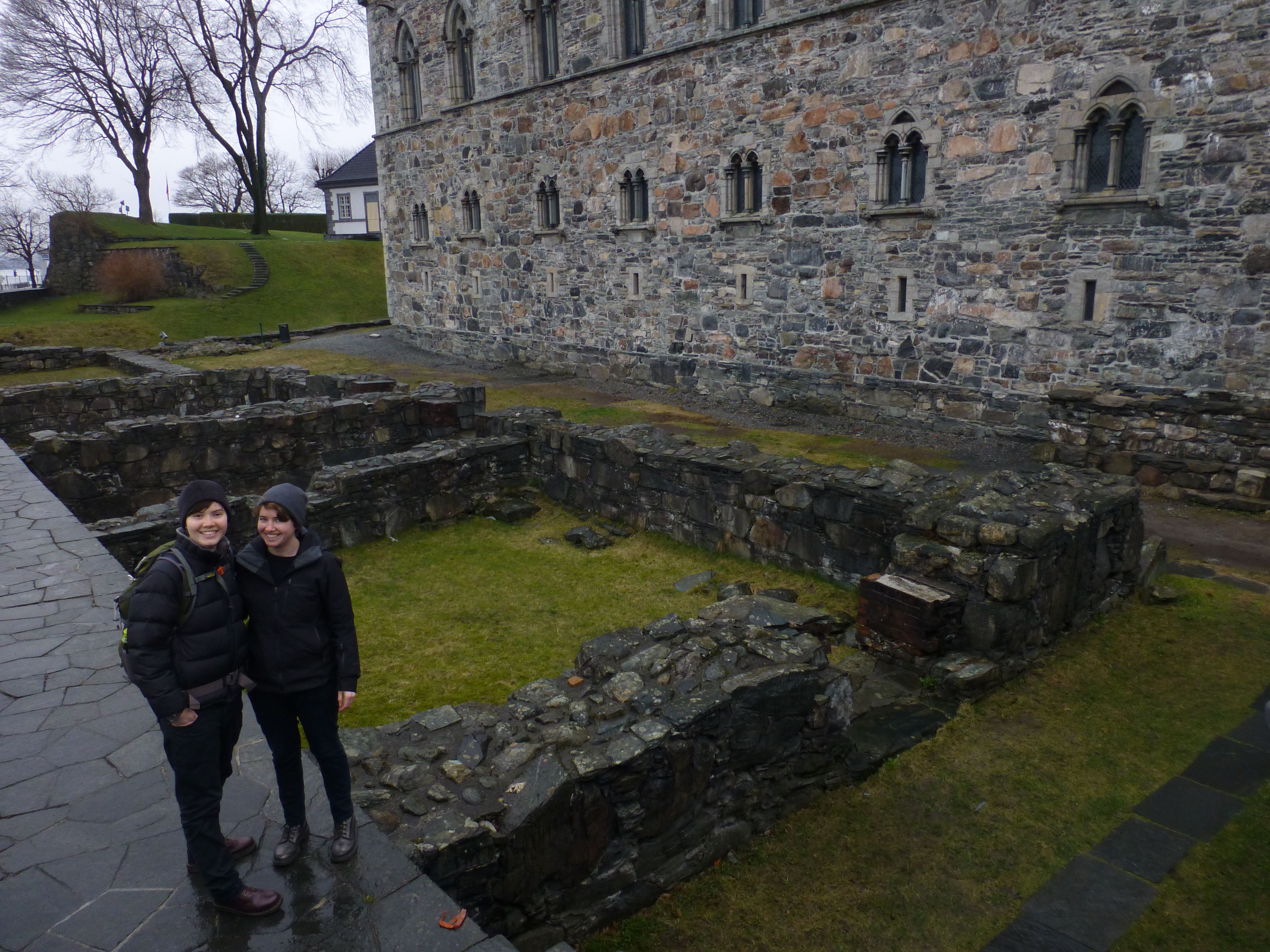 At the far end of Bryggen, away from the city center at the mouth of the harbor, is the Bergenhus Fortress, one of the best preserved castles in Norway. This is Mi and Alice, unaware that Kelly was taking this photo. It was the off season so we were unable to go inside the castle, but the grounds were open so we were able to admire the structures from the outside. The oldest buildings date back to the 1240s and newer constructions as recent as WWII, when Norway was occupied by Germany.