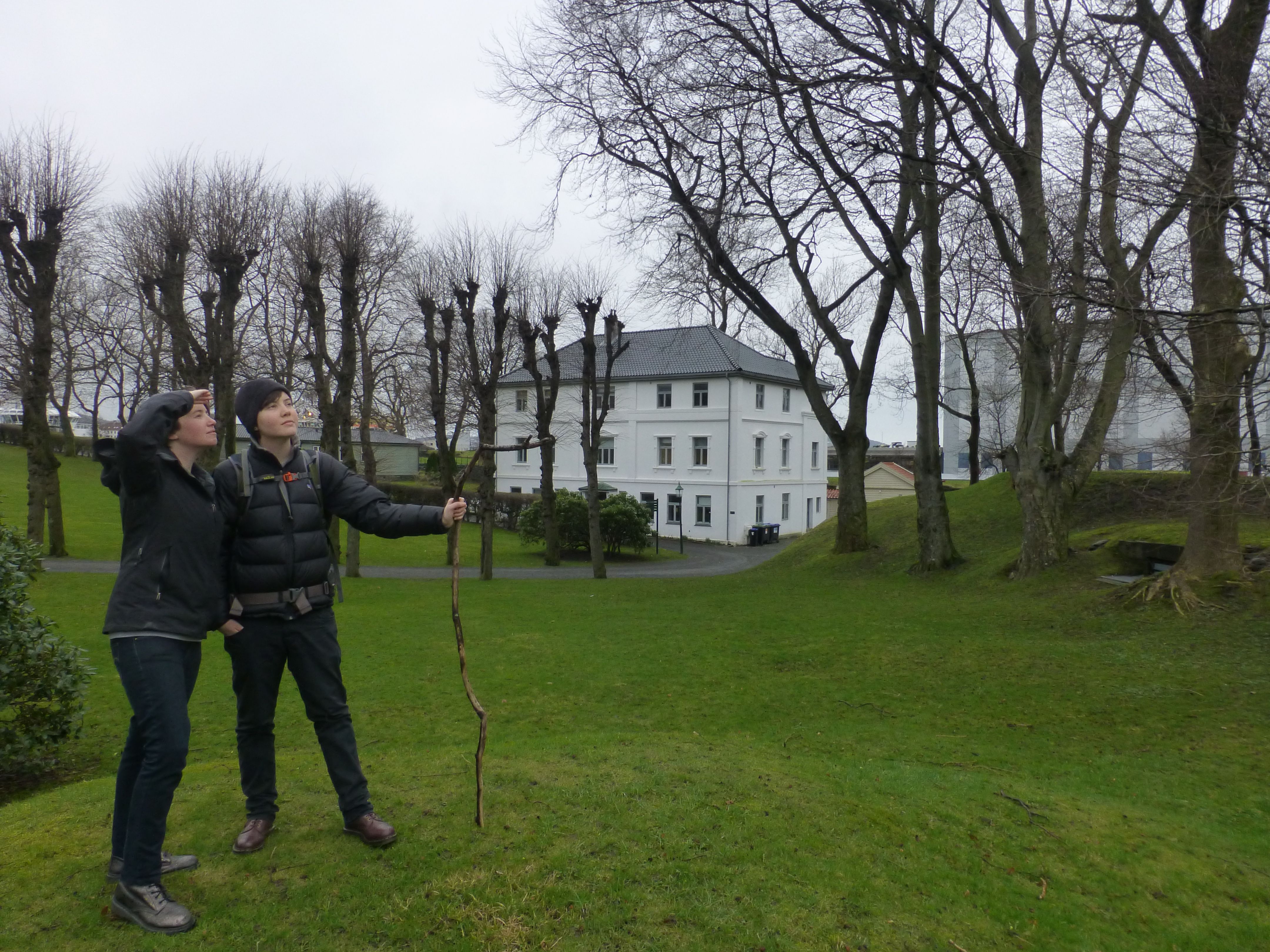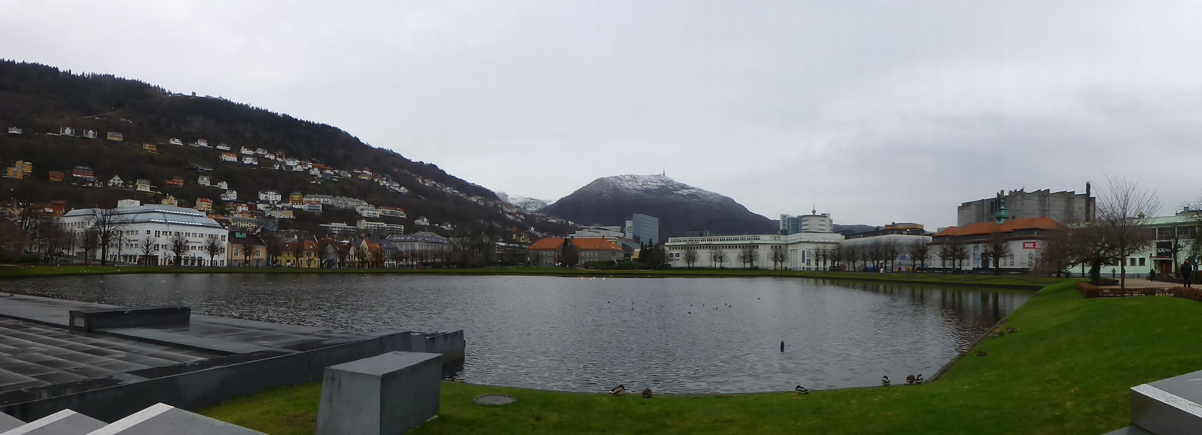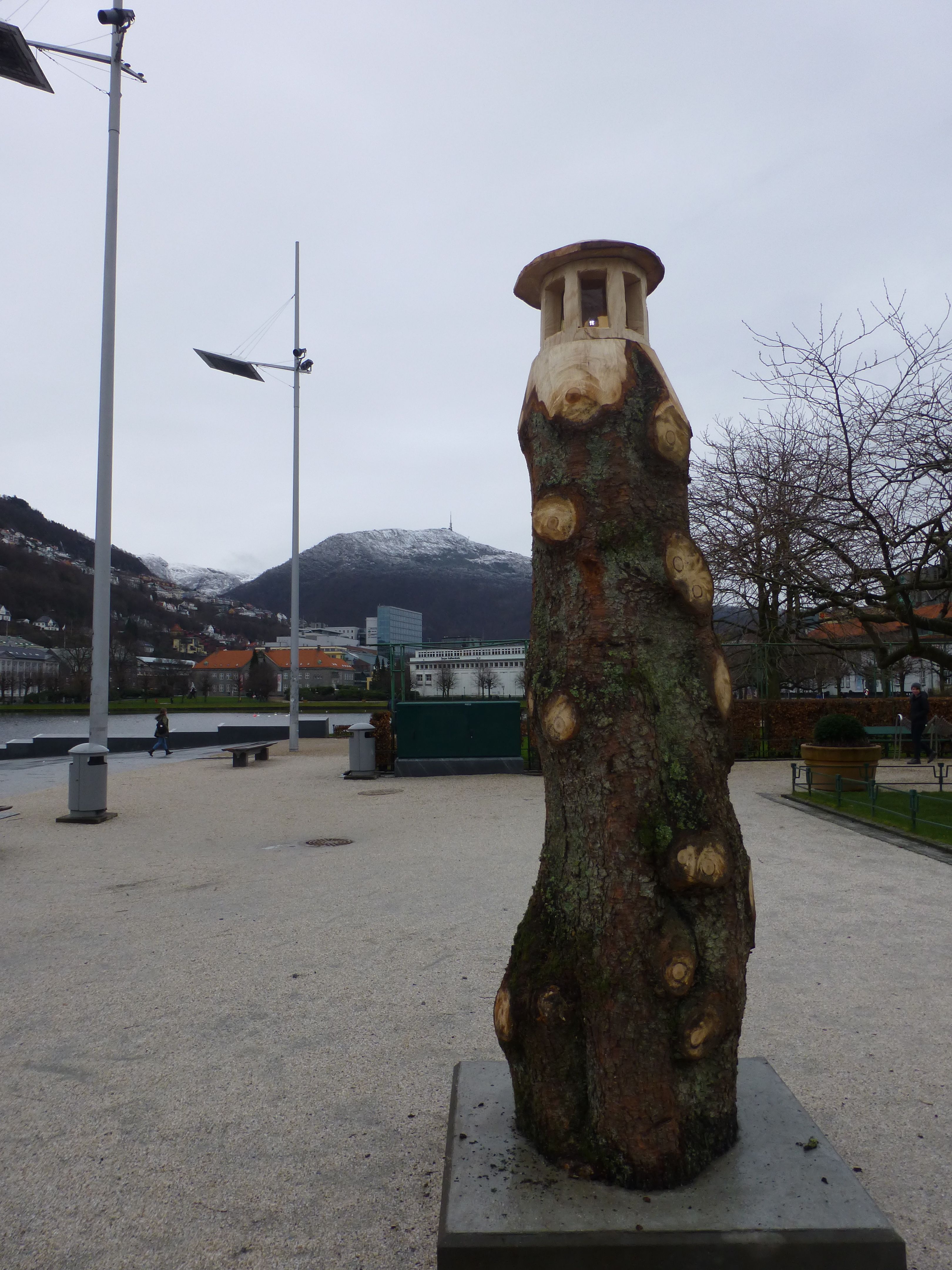 This is a new art installation that we discovered that day. It is a lighthouse with a rotating light in the top. The mountain that you can see behind the lake is the tallest of the seven that surround Bergen, at 643 meters above sea level. It is called Ulriken and unfortunately it is crowned with an unsightly TV tower.
