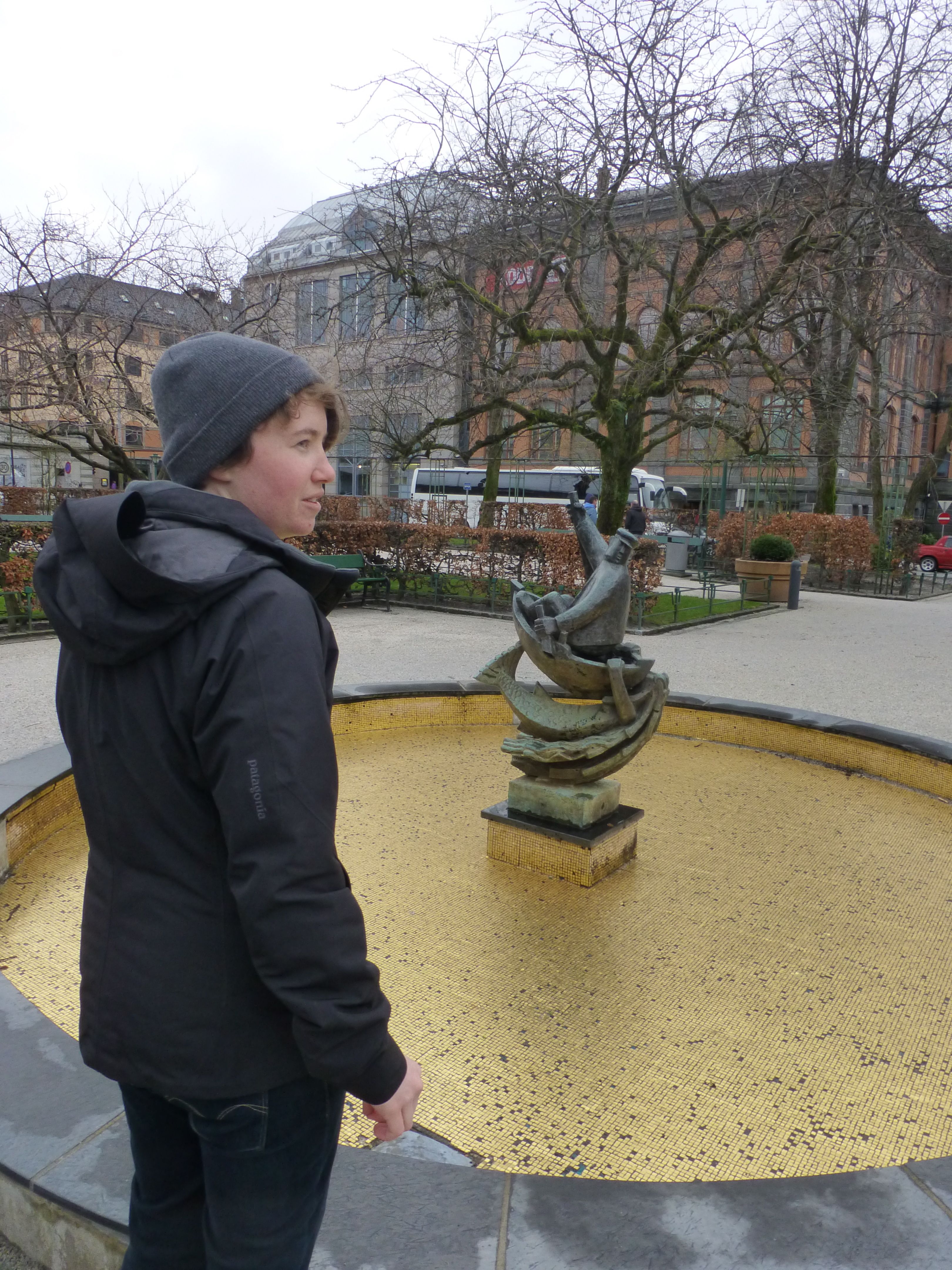 Kelly is admiring a waterless fountain (all the fountains are drained for the winter) in the park beside the city center. The park is dominated by a large lake (Lungegaard) and is surrounded by art museums.