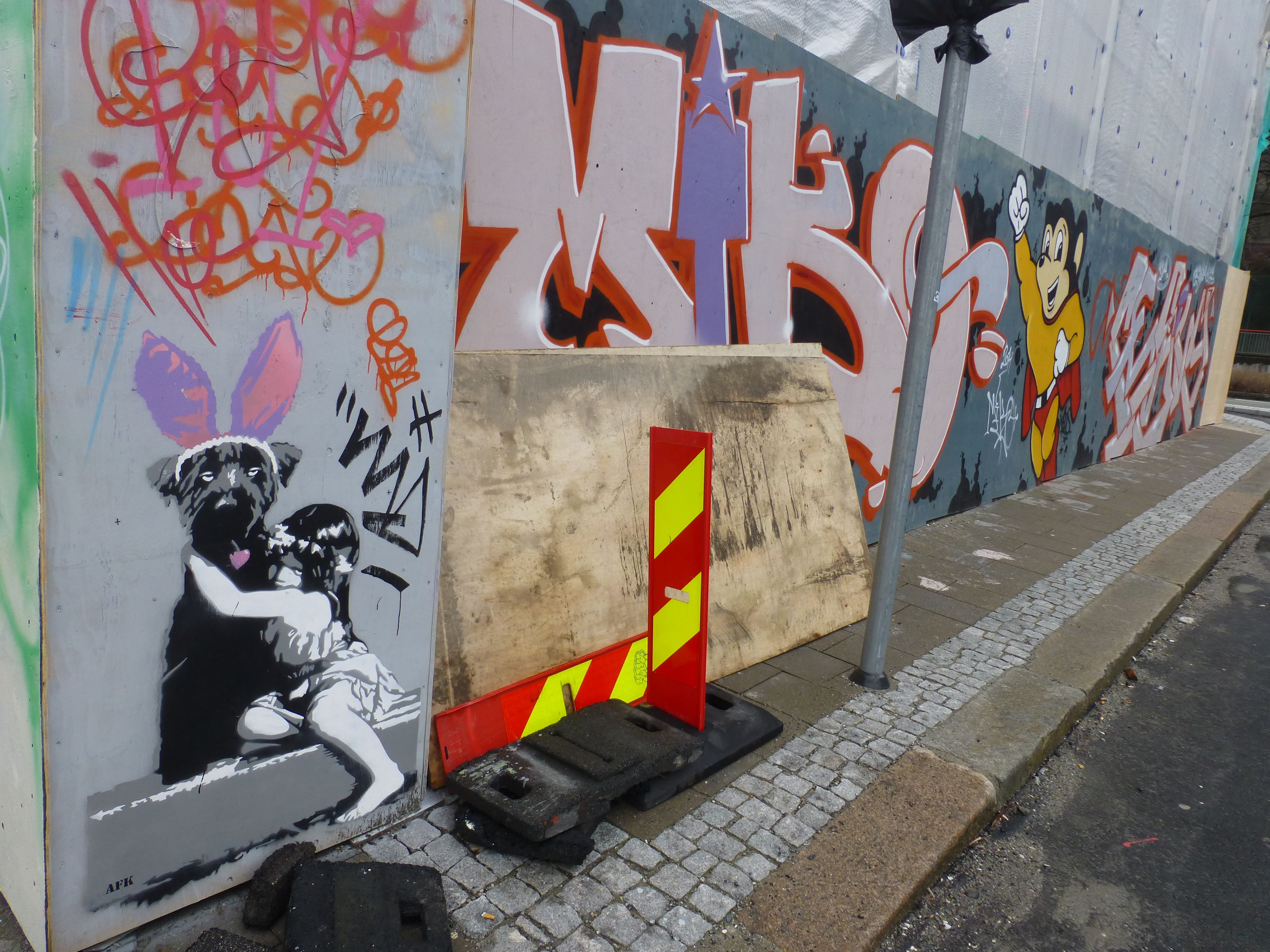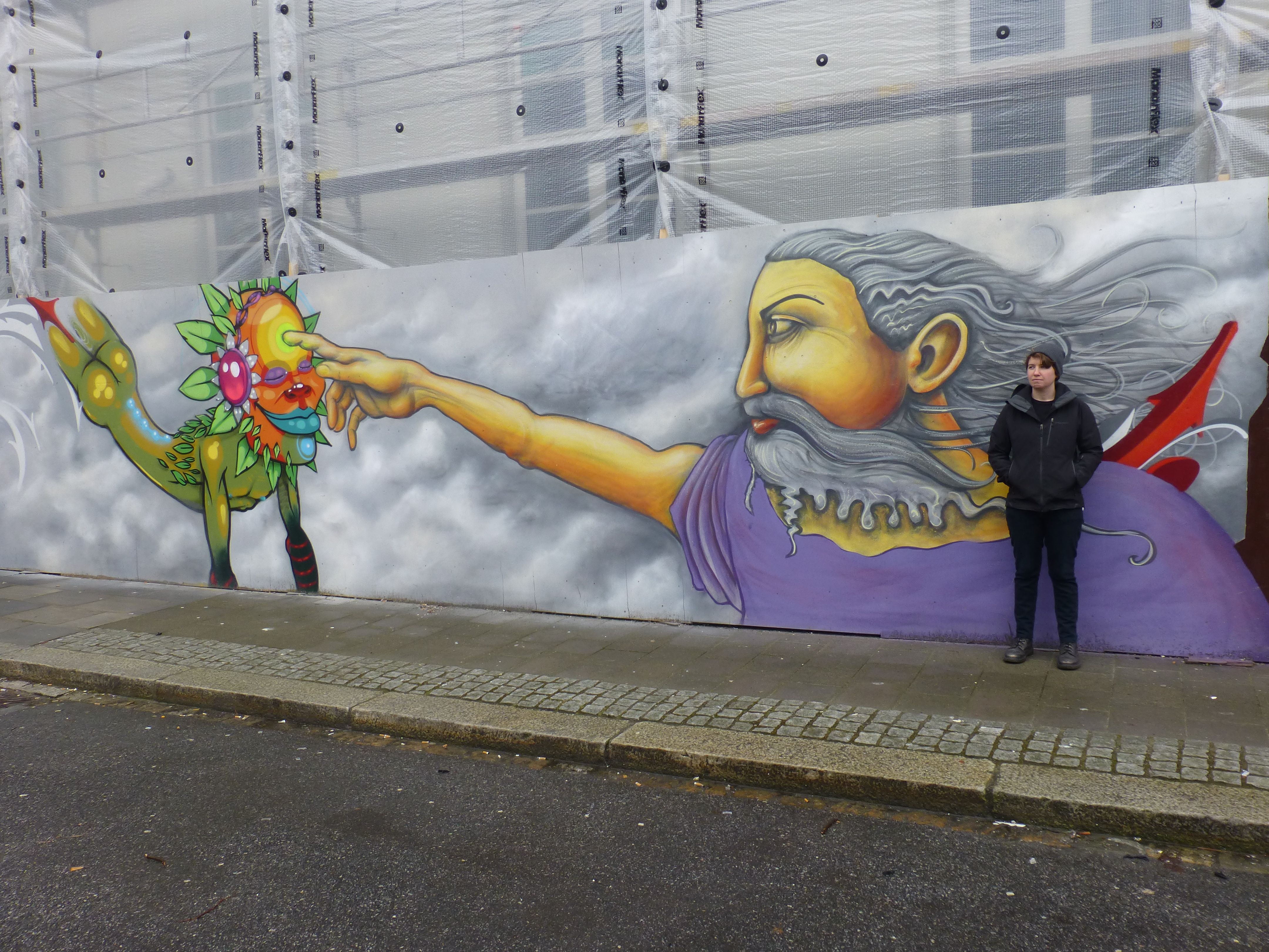 Street art is commonplace in Bergen. These paintings came up virtually overnight on the barricade around construction in front of one of the art museums.