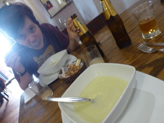 The flavor of this corn soup is best expressed by its color- could there be a more bland shade?! In the center of the table is a typical snack of toasted corn and blocks of traditional Peruvian cheese. Traditional Peruvian cheese is tasty enough, but it squeaks when you chew it, making it a little strange to eat.