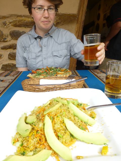 In the main square, we had our choice of a few restaurants all serving similar fare. Typically meat-eating tourists will devour whole cuy (guinea pig) and alpaca steaks, but as vegetarians our options were severely limited. We soon discovered that not only is Peruvian food lacking in diversity, but it is also very bland. The dishes on this table pretty well sum up the extent of the dietary availability and became our daily fare: pizza and quinoa (this plate is by far the most interesting version of this dish that we had).